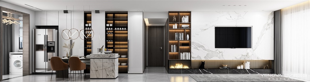 顶面使用了石膏板拉线,充分放大空间,简约又大方,使得整体空间得到了不错的通透性。