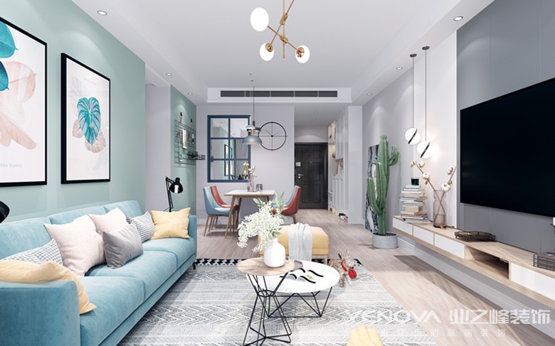 蓝色布艺沙发、搭配条纹地毯,和圆形茶几,十分简洁和谐,一眼看去沙发的颜色比较明快活泼,黄色的榻榻米也给客厅增加了一丝鲜活。木质地板搭配木质电视柜,明朗敞亮,这样的客厅既适合办公,也适合休闲。