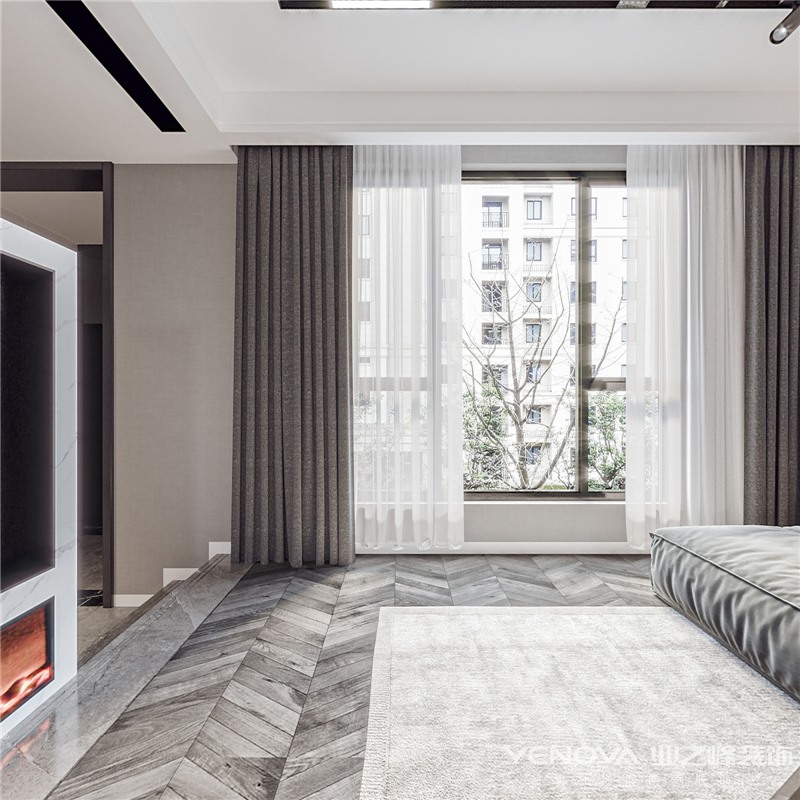 卧室以极简留白的手法通过不同灰度的墙布营造温馨宁静的空间氛围。业主喜欢灰色系,所以设计上以灰色为主调,通过不同的灰色材质之间的碰撞和相融合,打造出这方舒适恬静的生活空间。