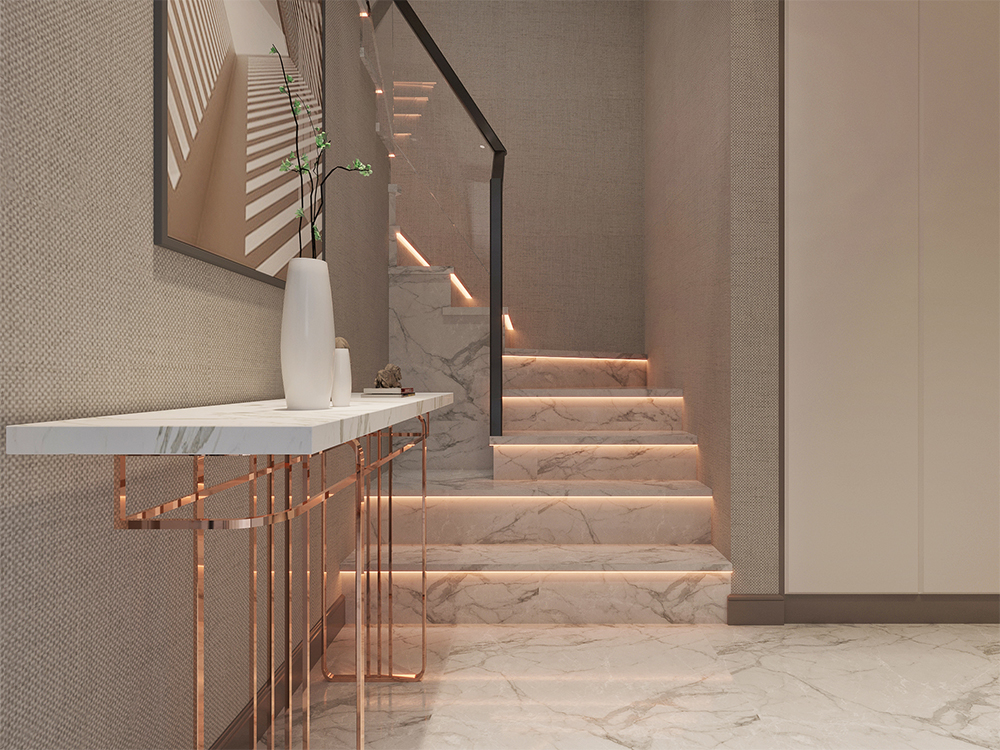 方案为四室两厅的户型,风格定向为现代简约式风格。本户型特点是空间面积较大,经过设计师的精心设计很好的划分了格局。本户型遵循业主要求装成现代风格,高档时尚。家具主要特色是强调力度、变化和动感,把高贵的造型与地面的铺饰融为一体。沙发墙则与电视墙相对。本方案顶面造型与地面造型交相辉映,区域划分明确,阳光透过窗户的照射把那缕缕的阳光洒下来,给这淡雅的空间带来光亮,造型的刻画、线性的展示勾勒出优美的线条。