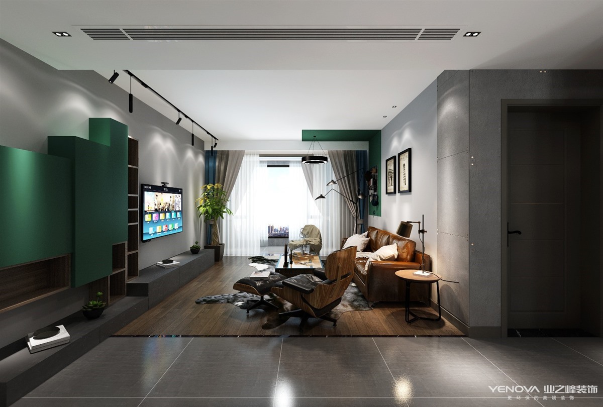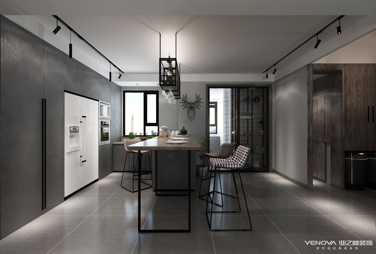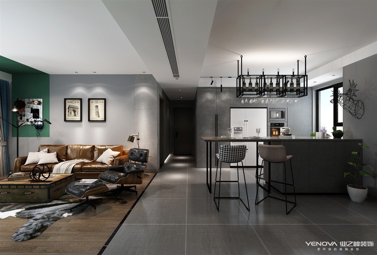 空间家居工业风的设计是现在很多年轻人比较喜欢的个性化设计风格。整个空间以黑色的铁艺为主,贯穿于整个空间,棕色的皮质沙发,黑色的窗帘窗框,吧台和点缀的工业风灯光、地砖以及天花板,营造了非常和谐的工业风之美。而无主灯的设计,轨道射灯及户型图