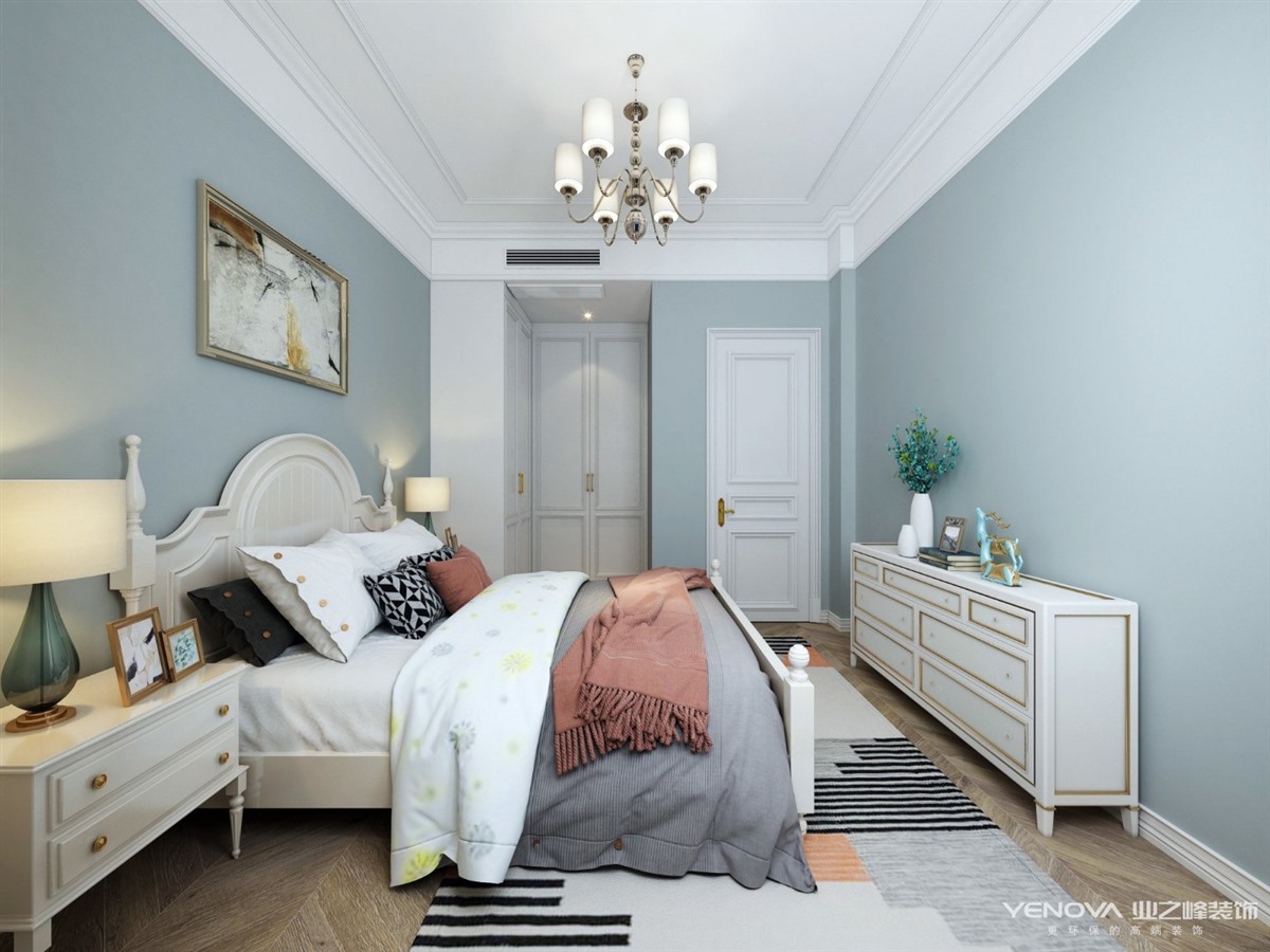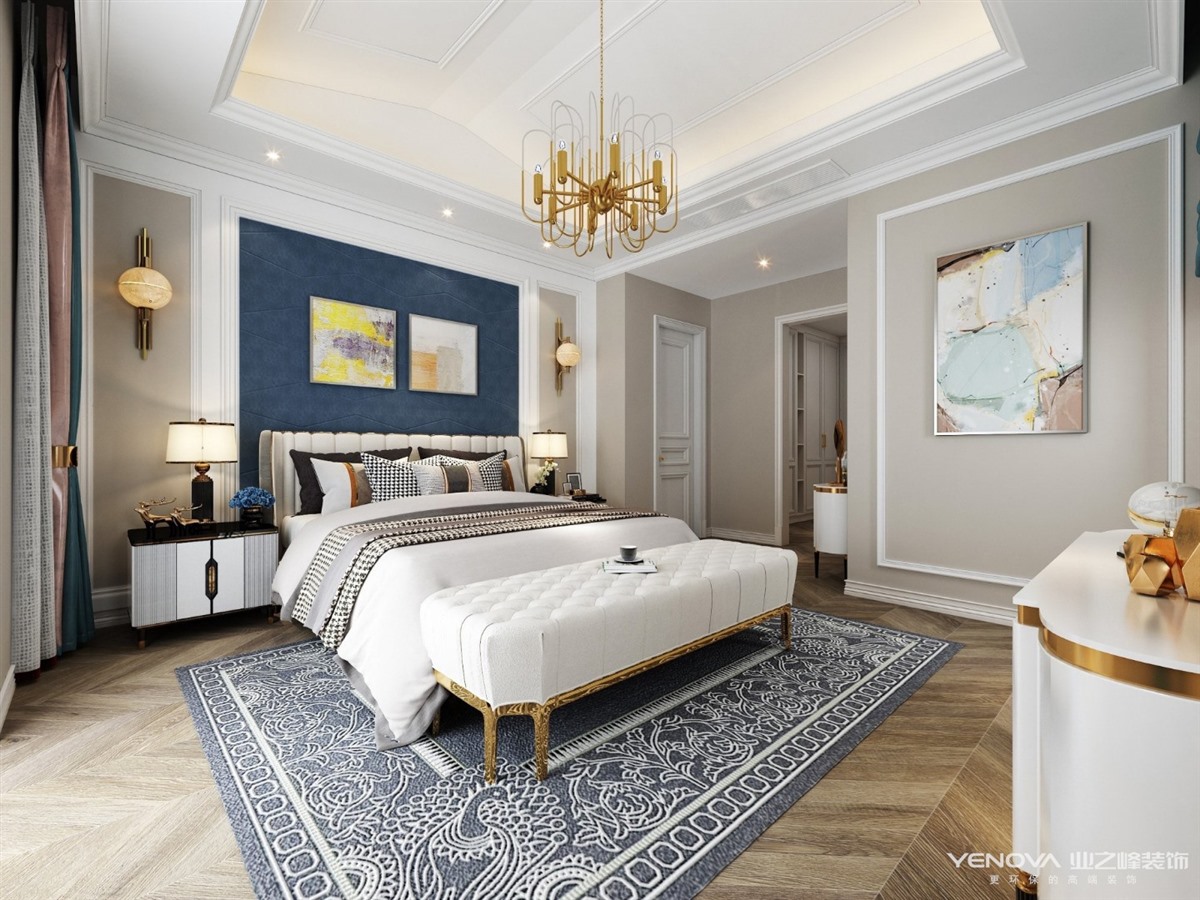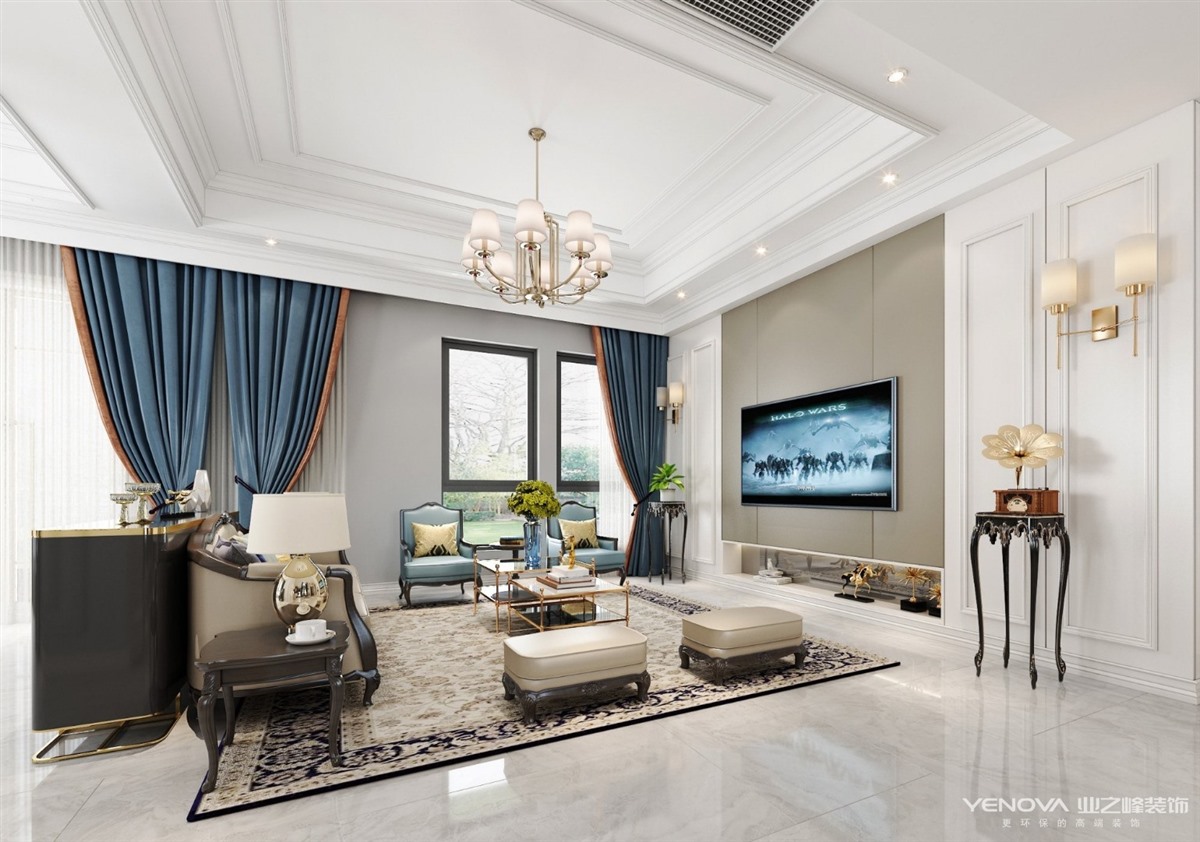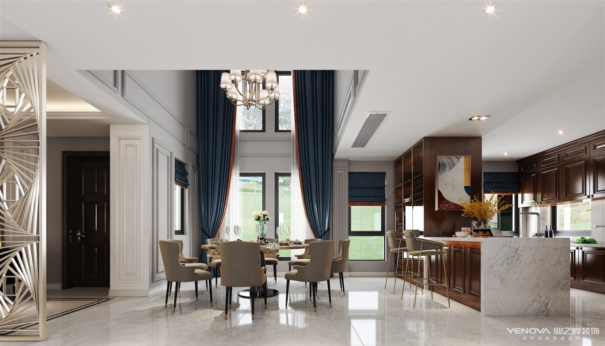 美式风格来源于欧洲文化,其风格并不过分强调繁复的雕刻,以舒适和多功能为主,但同时也不失怀旧、浪漫的感觉。居室色彩以白色为主,丰富的线条变化,空间环境表现出华美、富丽、浪漫的气氛。吊顶嵌入石膏线条搭配精致的水晶吊灯,营造出一种怀旧、浪漫的感觉。开放式厨房搭配岛台显得格外大气。