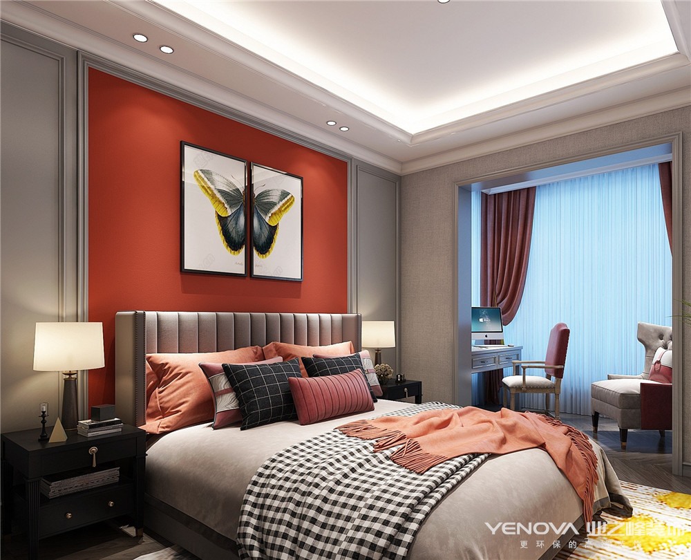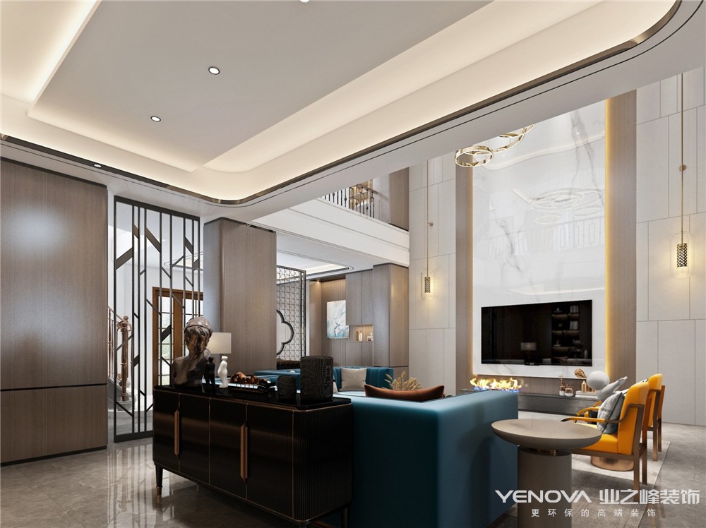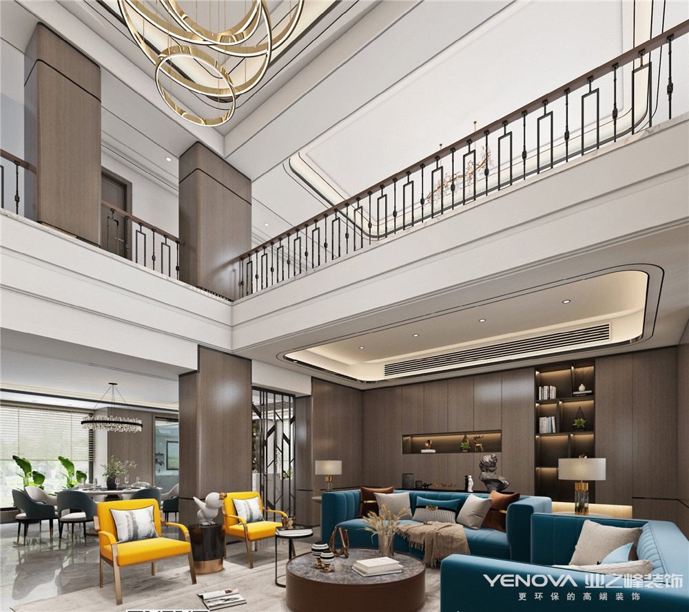 此案例户型结构是5室两厅一厨三卫带户外露台(顶楼复式),客户强烈重点要求空间通透、经常在家办公,有喝早茶的喜好。在设计方案过程中5室改成3室,书房和客户联通作开放式书房,采光和通透得到很好解决,楼梯使用半旋转式使空间更为流动。二楼设计全玻璃独立茶室,会客品茶不压抑,一楼风格为现代轻奢、二楼卧室为美式轻奢混搭。