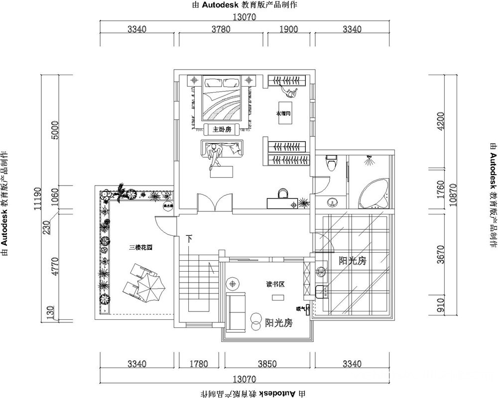 此案例户型结构是三层带地下室连排别墅,由于富一楼阴暗潮湿无光学,在设计中把一楼户外花园和富一楼隔层拆除至1米间距(详看一楼平面布局图),自然光线和通风都能达到满足。经过现场室外风水要求,原始结构的入户门改成厨房,主进门移至餐厅处,设计改造出外门庭和进户内门厅,客厅方向设计为花园后门庭。一楼主要布局:会客厅、茶室、餐厅、厨房、老人房。二楼主要布局:开放式书吧、女儿房、书房、次卧、衣帽间。三楼主要布局:主卧+衣帽间、读书区、户外露台、阳光房。富一楼:影音室、棋牌室、保姆房、室外花园。