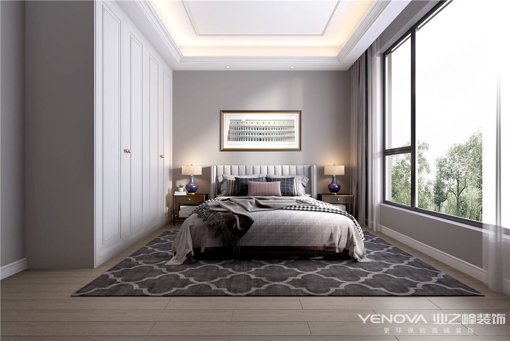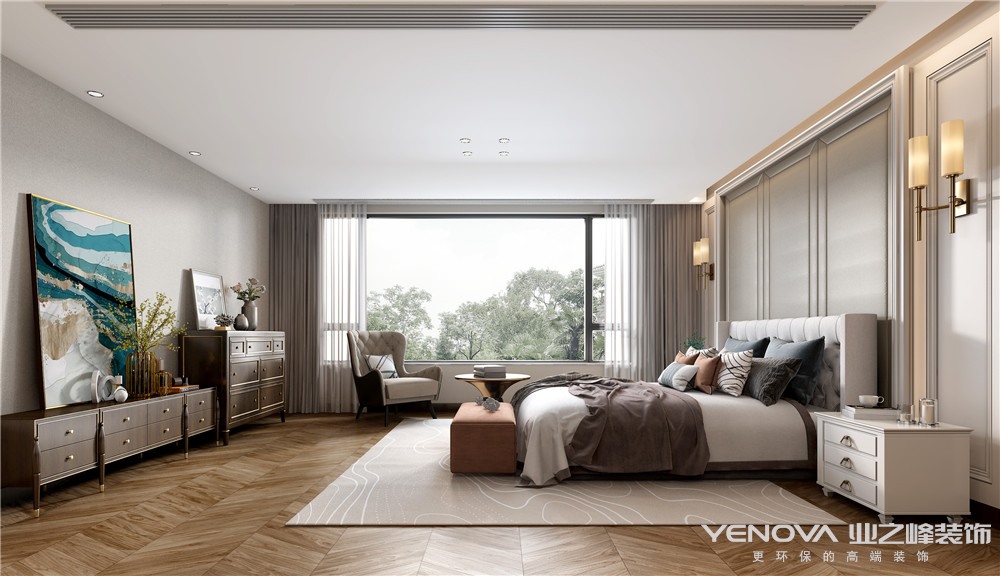 本案例为美式轻奢风格的别墅,整体色调以象牙白、驼色为主,经典美式轻奢的休闲式浪漫风随处可见。主卧自然系纹理木料搭配大量原木色系家具装饰,运用的复古元素恰到好处,使生活兼具温馨和仪式感。老人房配以玫瑰金边框挂画,紫金色台灯庄重典雅,同时在丰盈明媚的采光下,房间格调奢华十足却不显压抑。
