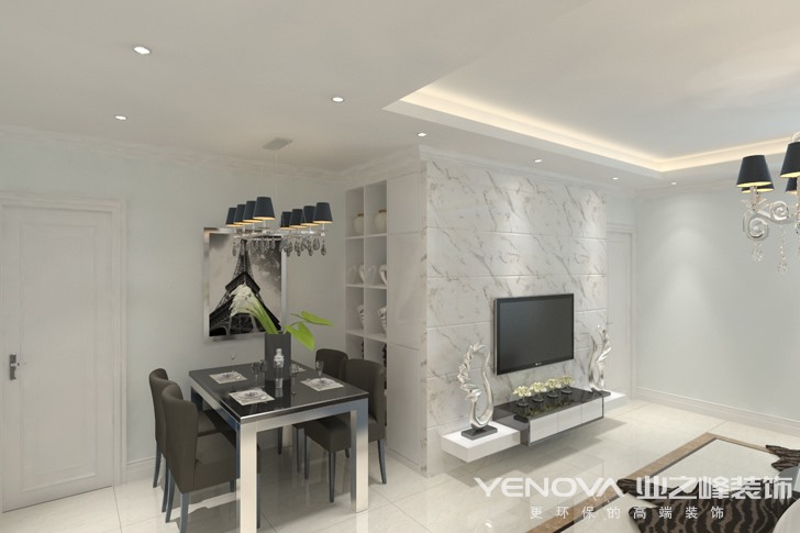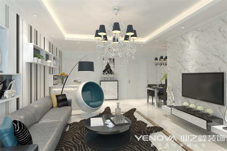 户型比较方正,流通性也比较好,所以没有进行拆改。在风格定位上,定位于现代简约,没有过多繁复的装饰。家具造型都比较个性,实用性和美观度都很不错。 【客厅】 这个客厅是个比较方正的一个空间,采光优良,所以,改动地方不大。整体色调以白色为主,少量的蓝色、灰色点缀,色彩层次丰富。沙发选择皮质的沙发,质感优良,灰色调显得很优雅,既不会太压抑,也不会太苍白。顶面造型就简单的做了灯池造型,暖色的灯光,十分温馨。竖条纹的壁纸,在视觉上,可以增加空间的高度,也显得十分时尚。墙面上做的收纳格,可以放置摆设品,实用性强。大理石的电视墙,纹理漂亮,暖色的纹理,很好的缓解了白色带来的苍白感。不锈钢材质的吊灯,黑色的灯罩,色彩对比强烈,现代感十足,成为了整个空间的点睛之笔。蛋壳形状的椅子,造型可爱,颜色靓丽时尚,很适合户主这样年轻的客户。