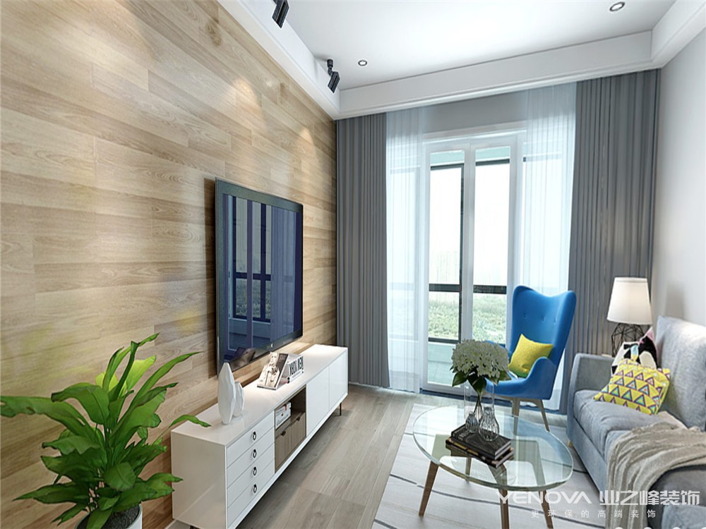北欧风格,整体为暖色系。客厅设计为休闲区域,电视背景墙为木地板上墙,简洁明亮,吊顶为一级顶配合灯带是整个天花层次分明,整体色彩家具颜色搭配醒目、简洁大方,