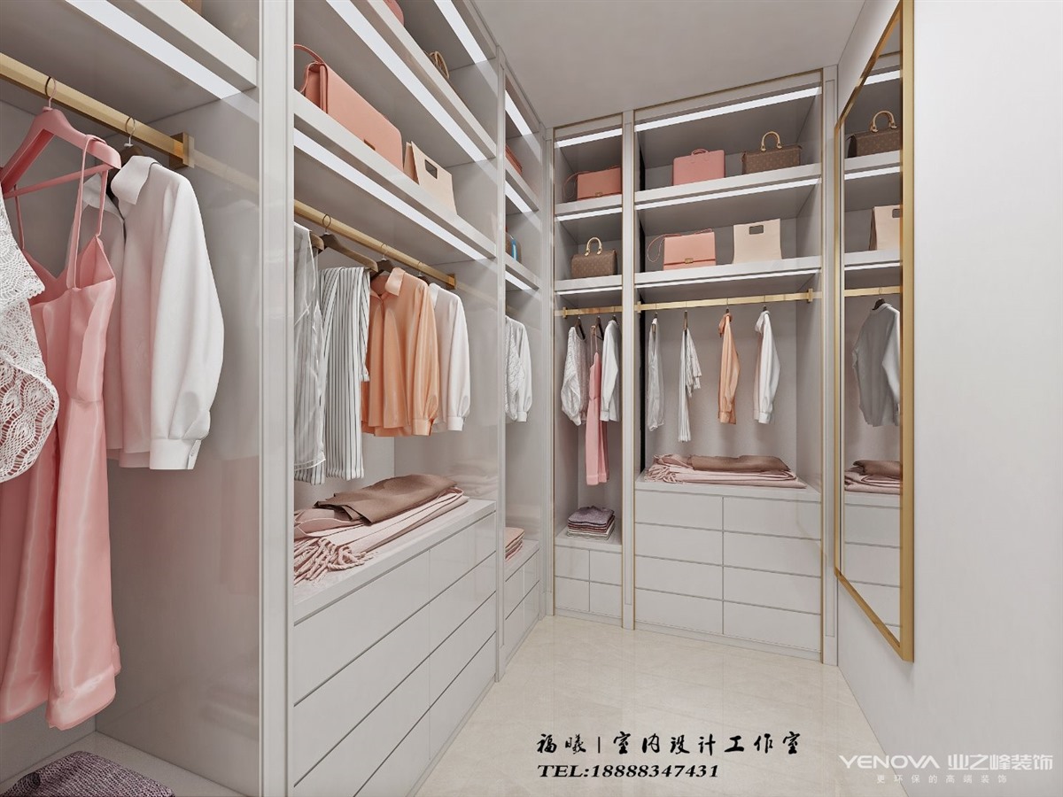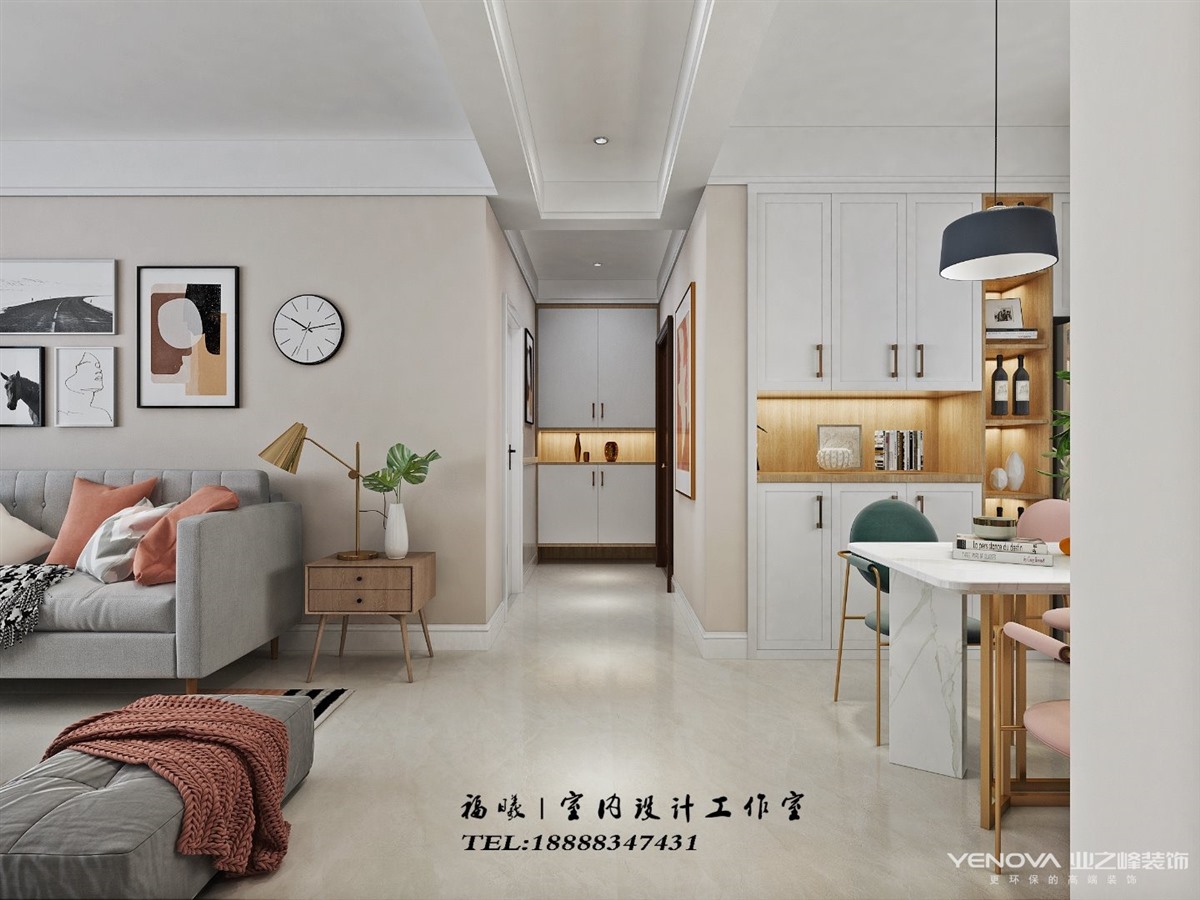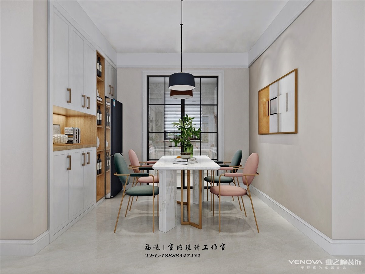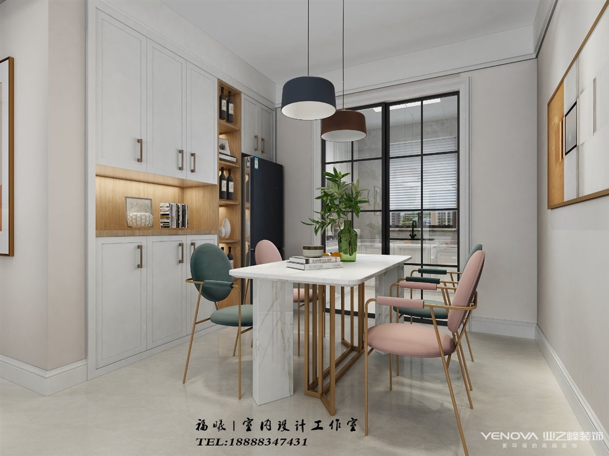 餐厅是白色色调,在可能的位置都做了储物柜,餐桌是白色大理石,粉色餐椅调和空间氛围,记录着幸福甜蜜的每一天。