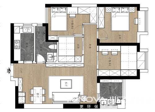 本案是正规三房,由于居住人口较多,把储藏室扩大做了多功能房,既能储物也能当作卧室。