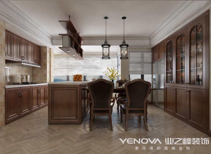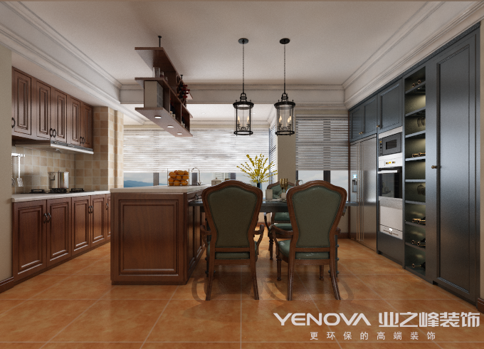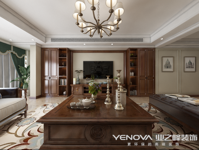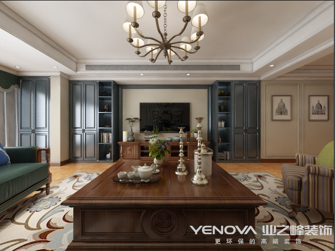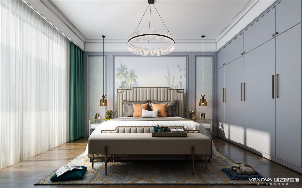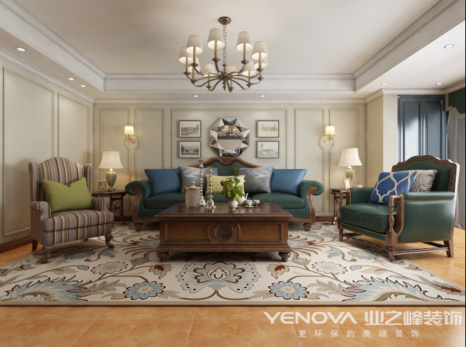 本案例户型方正,南北通透,业主喜欢华丽高雅的美式风格,我们采用带线条的石膏吊顶,营造出一种怀旧、复古的感觉。客餐厅以仿古砖地面装饰材料,华丽感佳,在沙发区铺上大幅花纹地毯,使空间区域划分更加清晰。复古造型的组合沙发,以及茶几都具有上乘的质感,让美式古典风格得以进一步的彰显。阳台和客厅以及开放式的厨房联通设计让整个空间更加显示出美式风格的通透、大气感。卧室:美式风格设计理念中的卧室,通常是以功能性和实用舒适度为主要设计理念。