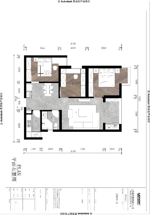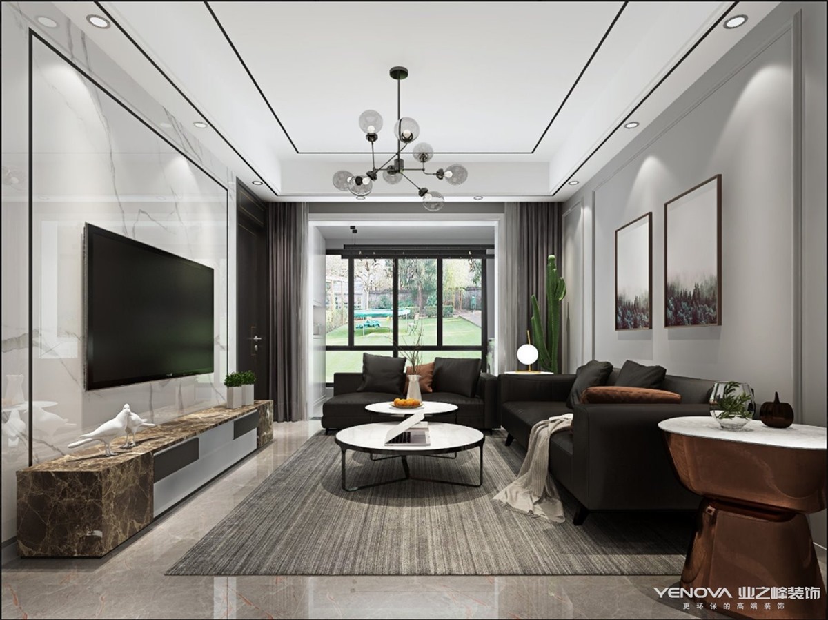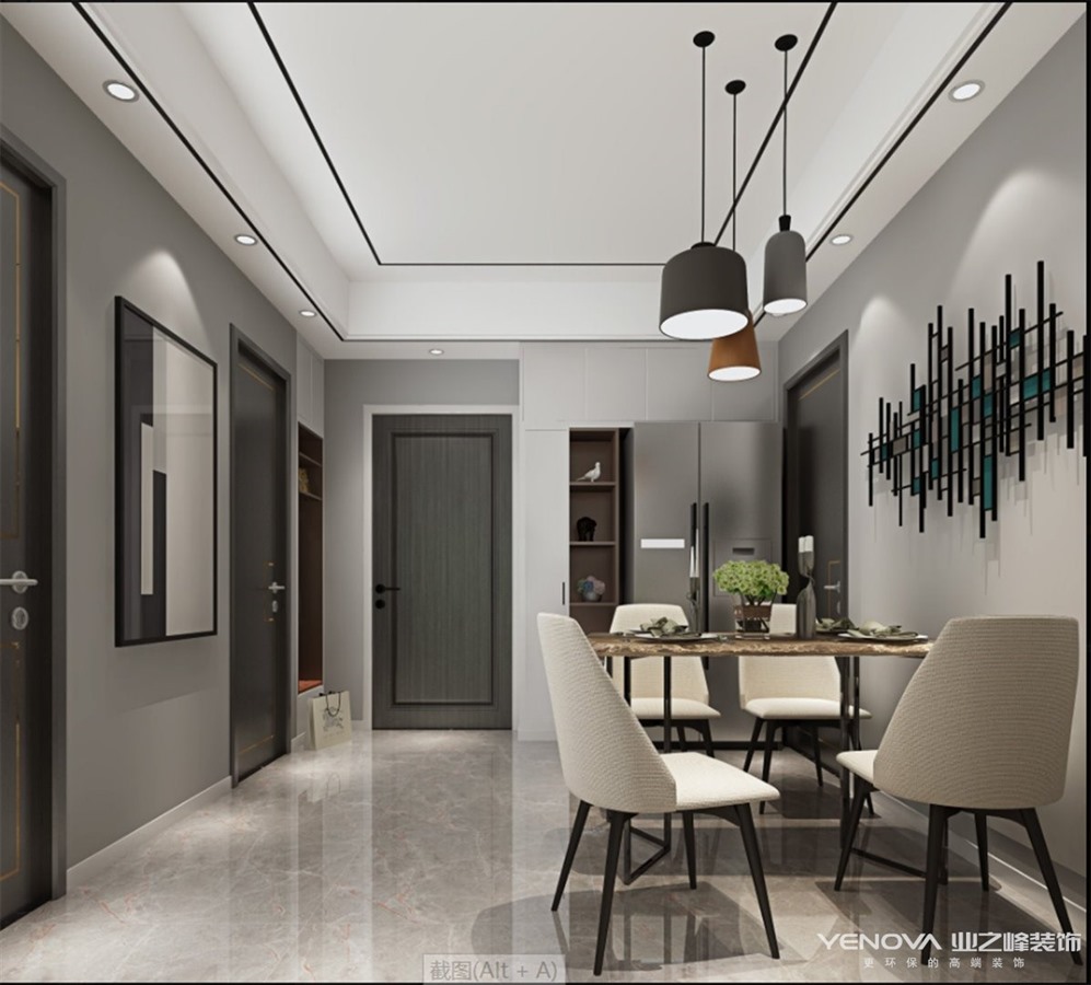 此户型为三室两厅一厨一卫,客户是三口之家的人员结构,儿子是做奢侈品代购,所以单独拿了一个房间做衣帽间,直播间用,比较注重整体房子的效果,颜色用的黑白灰色调,顶面做的金属线条加以装饰,地面是灰色的大理石瓷砖,和整体色调相呼应。