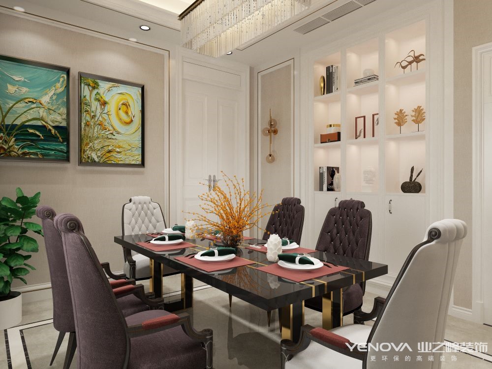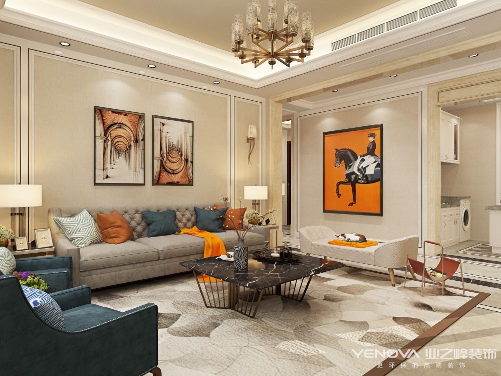 客餐厅及走廊地面跟顶面的搭配彰显出空间的立体,轻奢大气、更贴近于自然。这种风格从整体到局部、从空间到室内陈设塑造,精雕细琢,给人一丝不苟的印象。