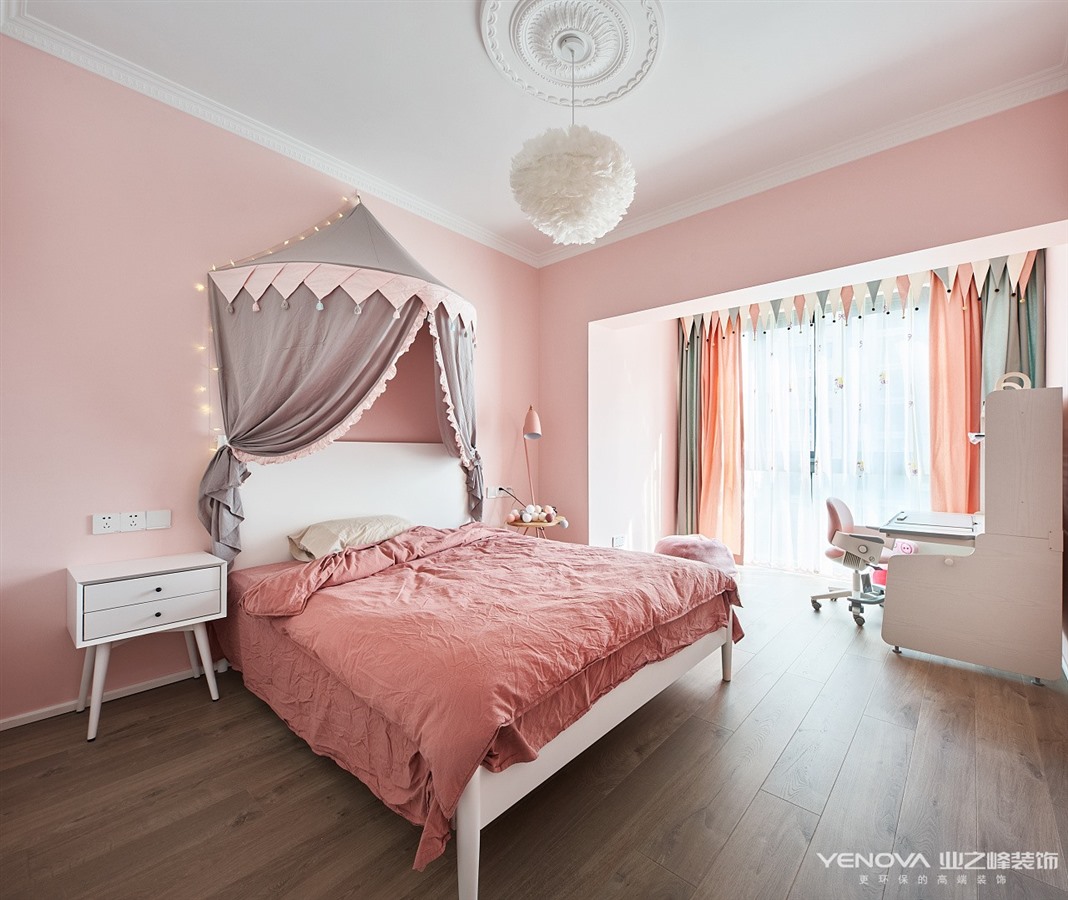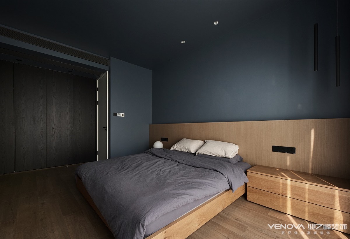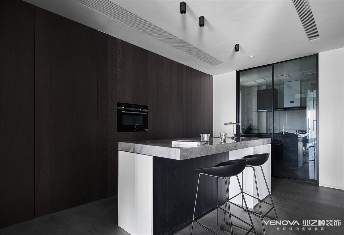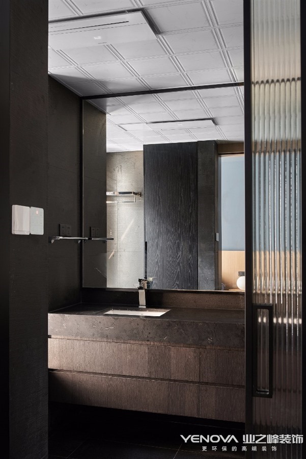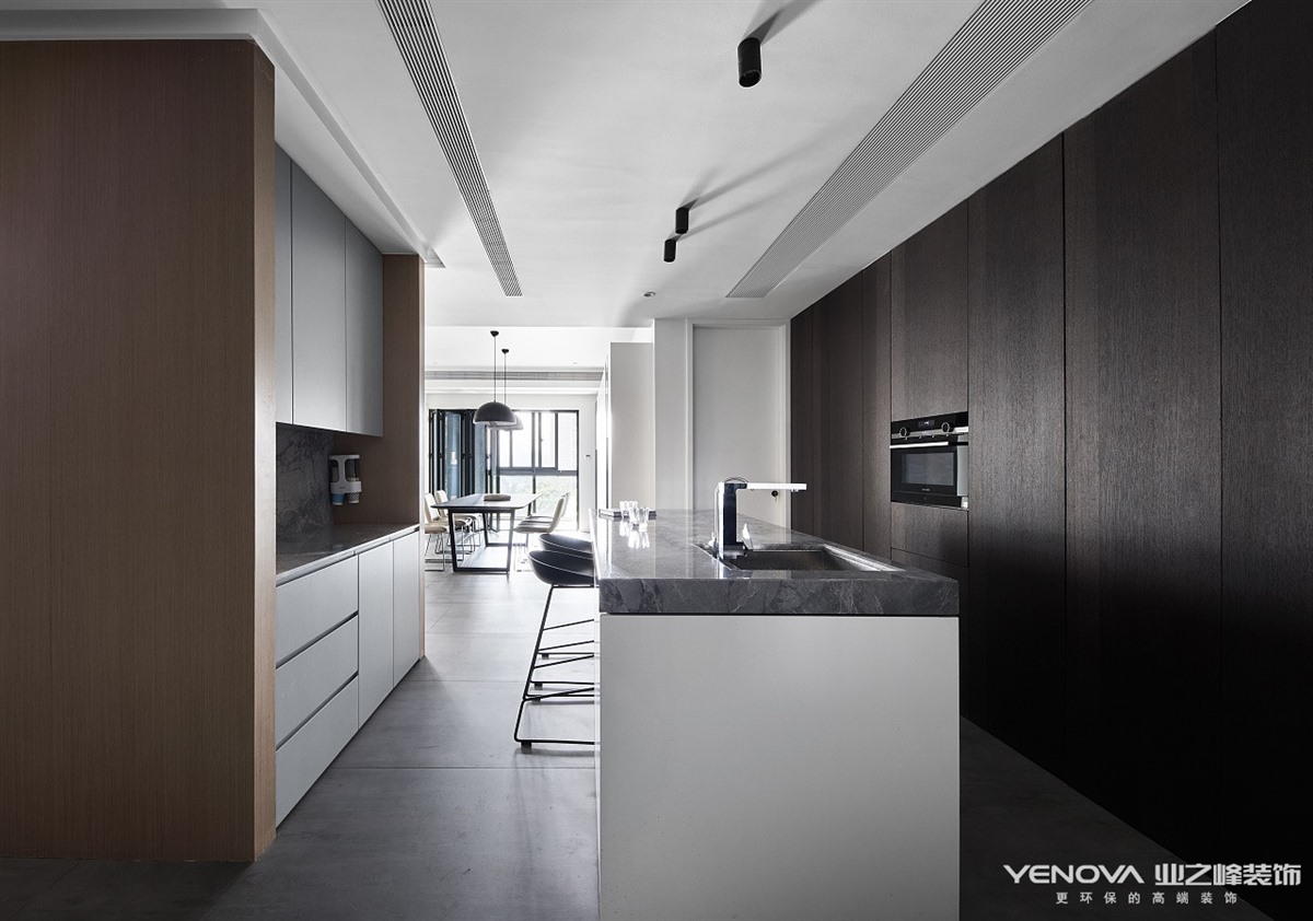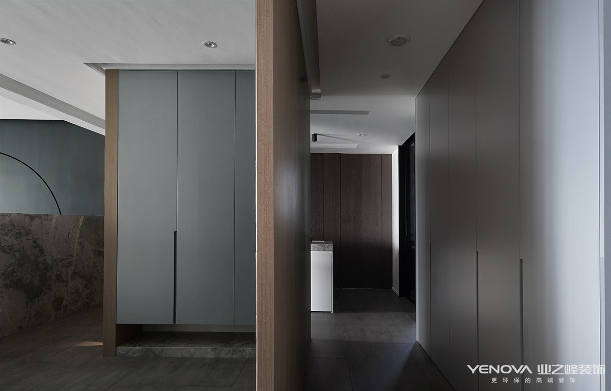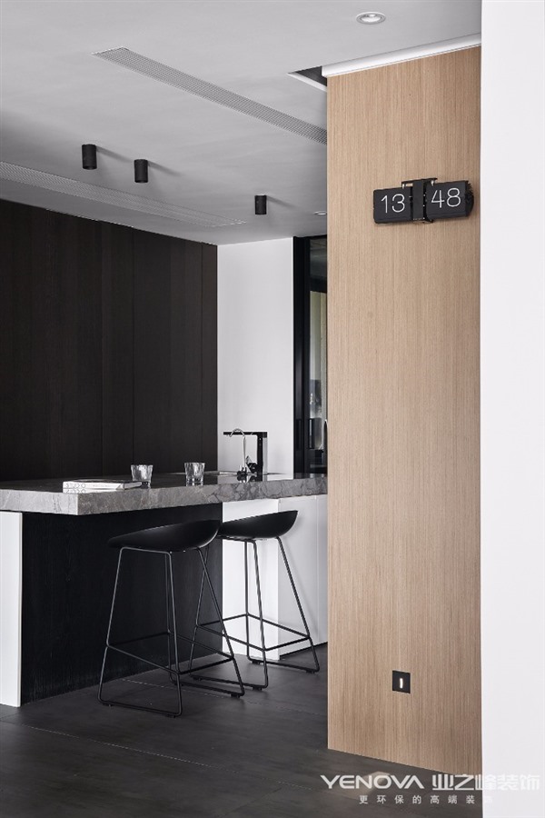 在材质的选用是具有肌理感的木纹墙板和纯净的白色烤漆墙板