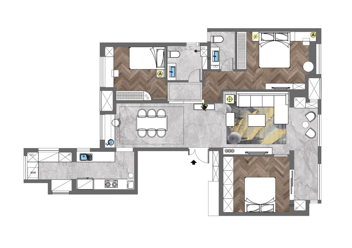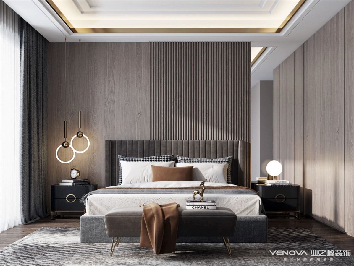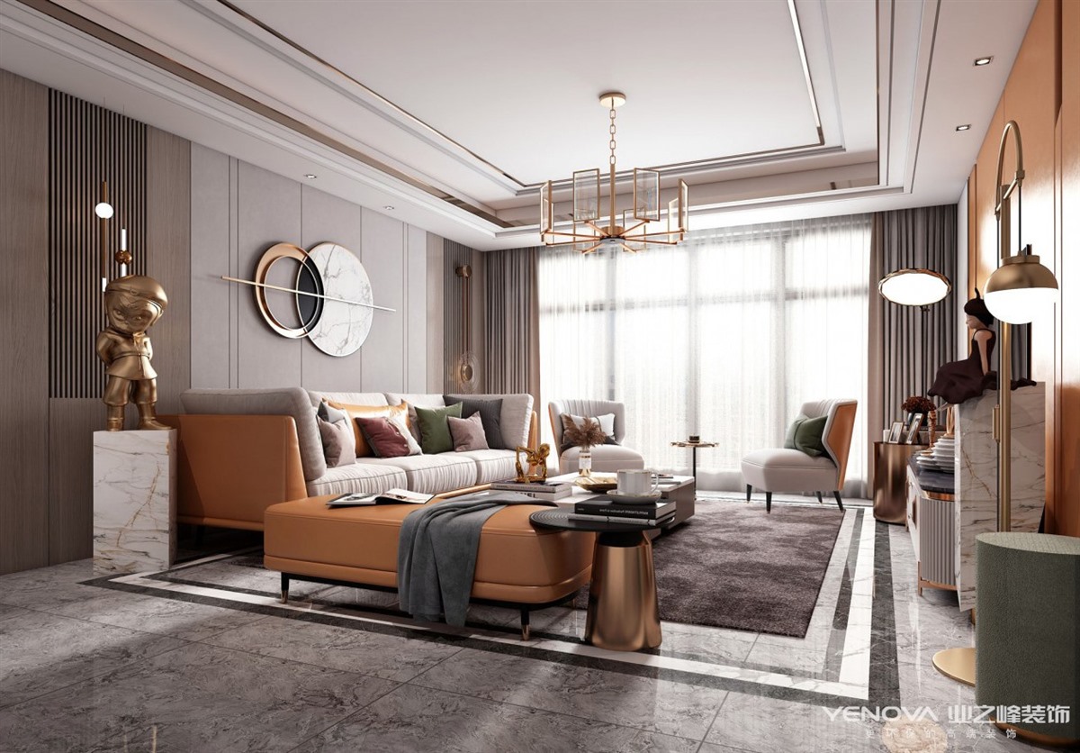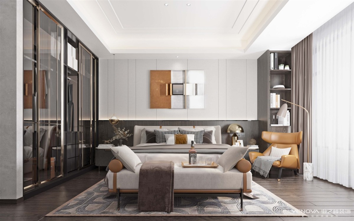 本案采用了现代轻奢风格。对户型结构的合理改动,在储物空间最大化的同时规划出合理的收纳分区,让家里美观与实用兼具,后期入住之后同样可以保持空间的干净整洁。客厅空间连贯外景阳台,最大限度的延伸空间;考虑到厨房与餐厅的互动性,在餐厅增设西厨作为补充,既相互独立又不会影响空间的通透性;卧室套间处调整了原本过道的空间比例,合理的划分空间使得体验感更舒适。公共空间整体采用了对比明快的色彩搭配,空间更灵动,从色彩上对空间区域进行划分,同时在墙面的质感上也有不同层次的变化,细节让空间有更多的惊喜;卧室作为休息空间色彩相对沉稳,部分元素与公共空间相呼应,整体感更强。
