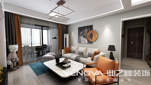 客厅:客厅在接待访客作用的同时,还为男主人鞋子的展示区域,因顾客的需求,我们把电视柜做成了玻璃展示窗,客厅的墙面为浅灰色,客厅与过道都为木地板,增添了空间温暖的感觉,空间内用橘色为点缀色,给增添了空间的活力,客厅天花采用的艺术的小吊灯,吊顶四周设置白色灯线,在不压低空间的同时,增加了顶面空间的层次感。