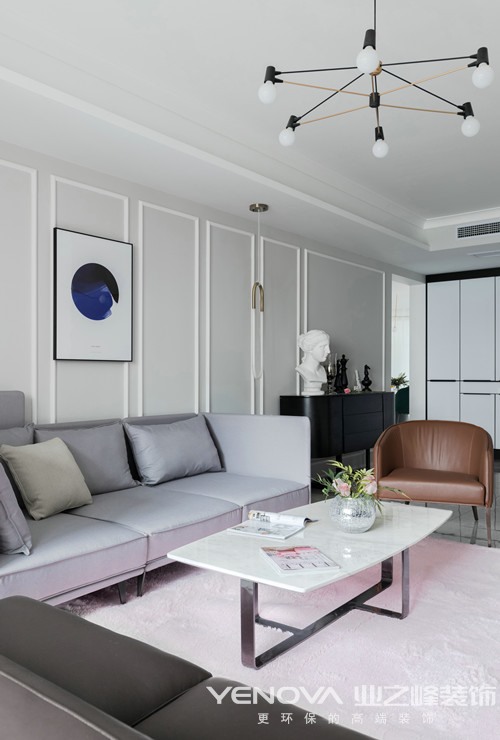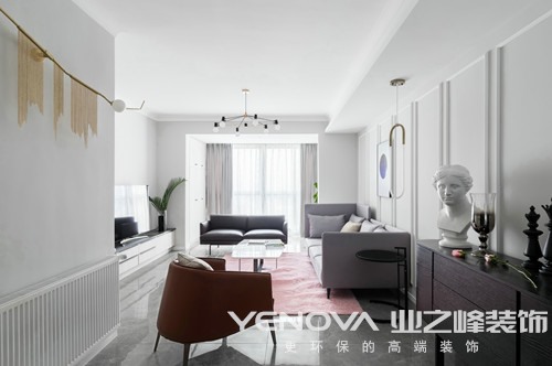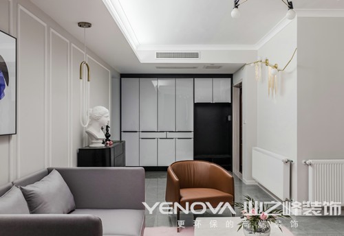 本案原结构南北通透,户型方正,本案风格以简约为主,搭配金属的灯具,点缀一些鲜明的色彩,