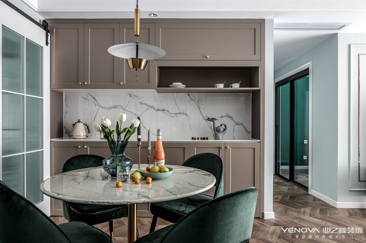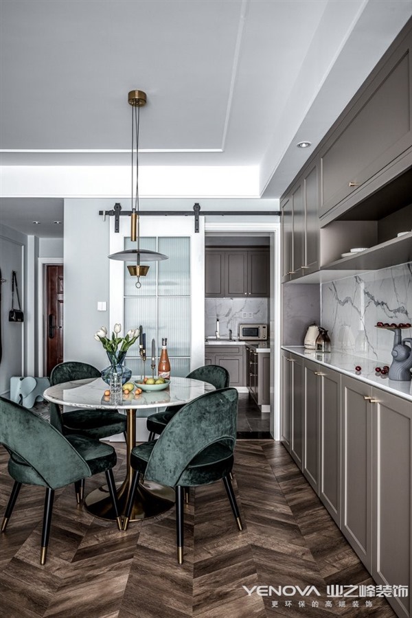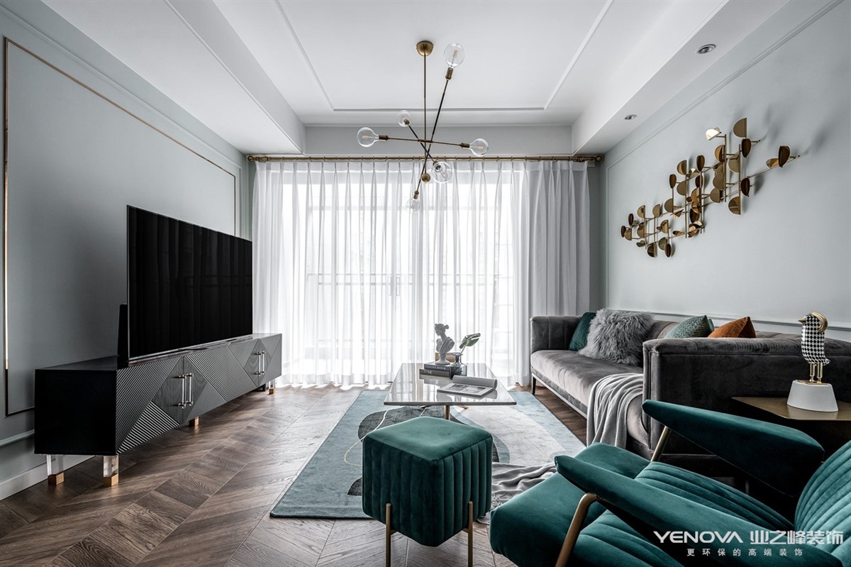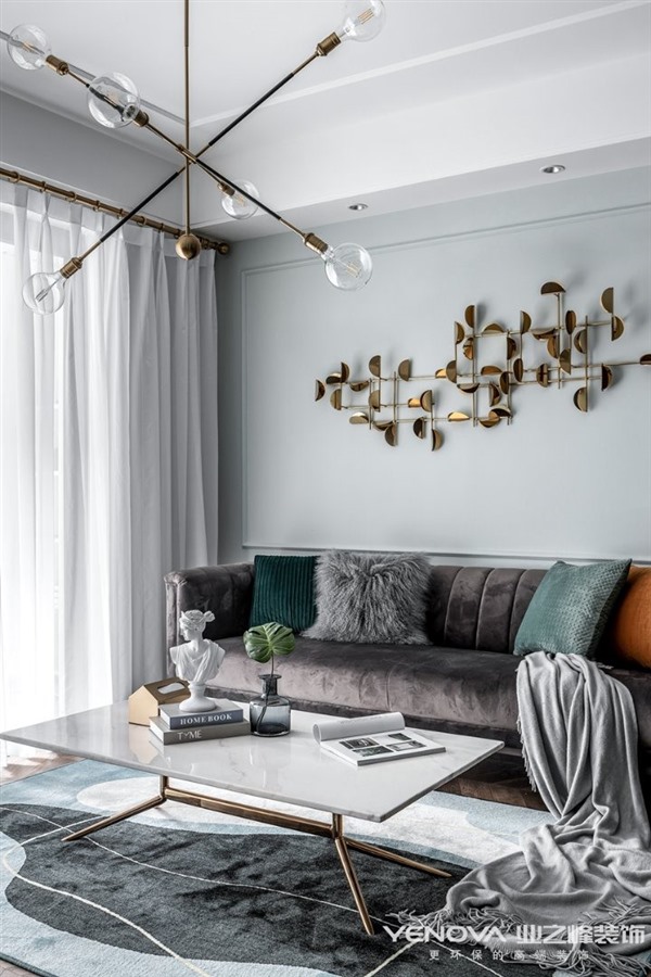 考虑到有一位五岁小男孩共同入住,所以我们在一些公共区域增添了很多三人互动的区域,在兼具轻奢风格的情况下又能赋予生活带给他们共同的生活乐趣。交错的设计感主灯的使用丰富了客厅的层次感,半透明窗纱让阳光能够更好的穿透到室内,使空间明亮通透。餐厅