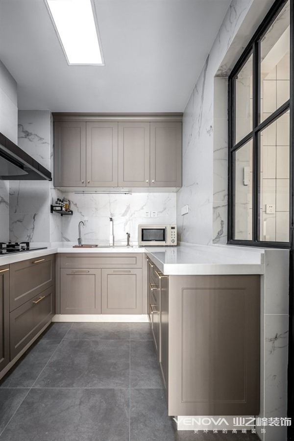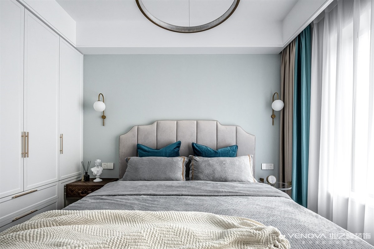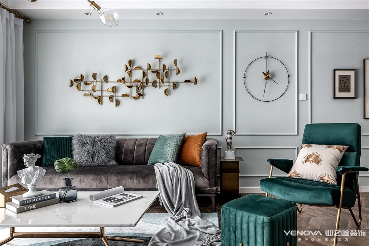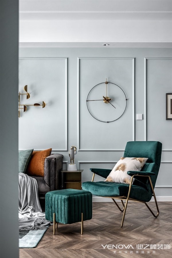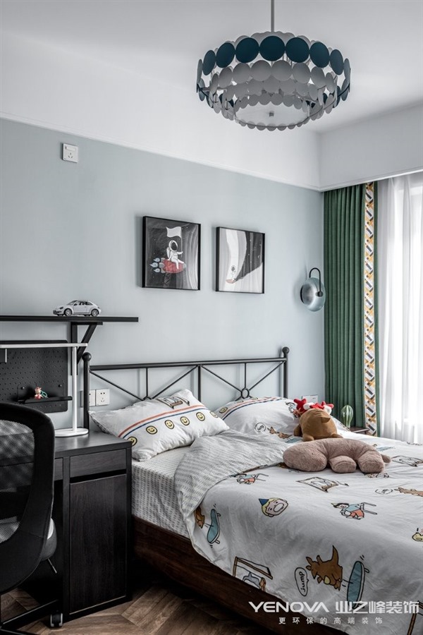 考虑到有一位五岁小男孩共同入住,所以我们在一些公共区域增添了很多三人互动的区域,在兼具轻奢风格的情况下又能赋予生活带给他们共同的生活乐趣。交错的设计感主灯的使用丰富了客厅的层次感,半透明窗纱让阳光能够更好的穿透到室内,使空间明亮通透。餐厅