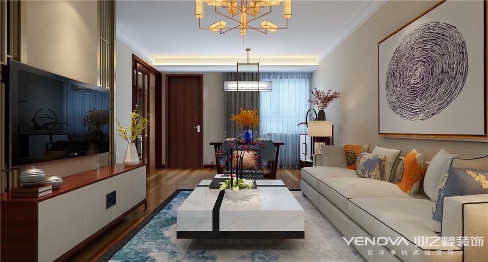 去除传统中式的冗重,新中式家具形制轻盈而神韵气足,增加曲线设计,舒适感倍增。硬朗简洁的线条打造空间的层次感,棉麻材质配色轻松自然,灯具、挂画、绿植、摆件,无一不体现中式特征,布局阴阳协调营造意境感。