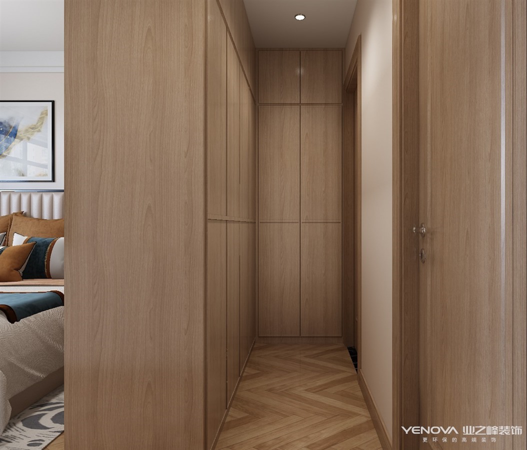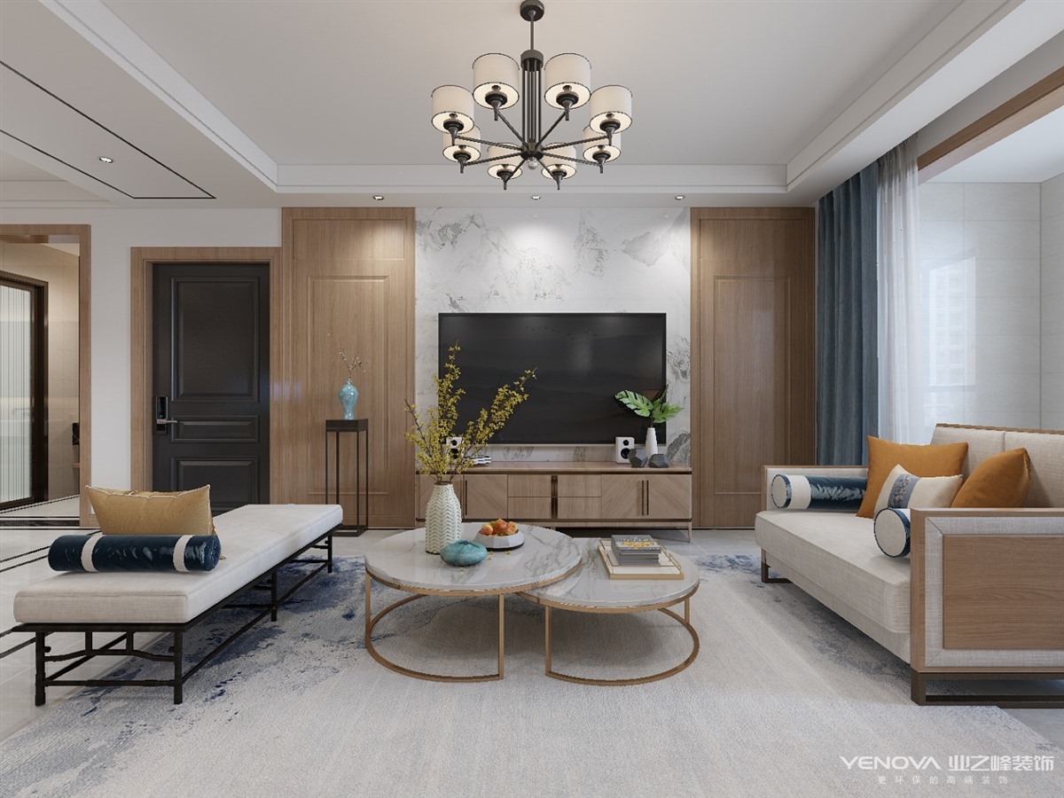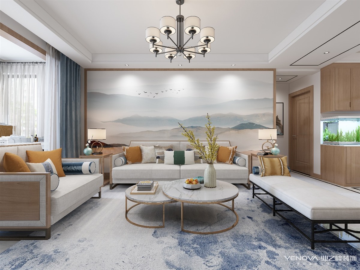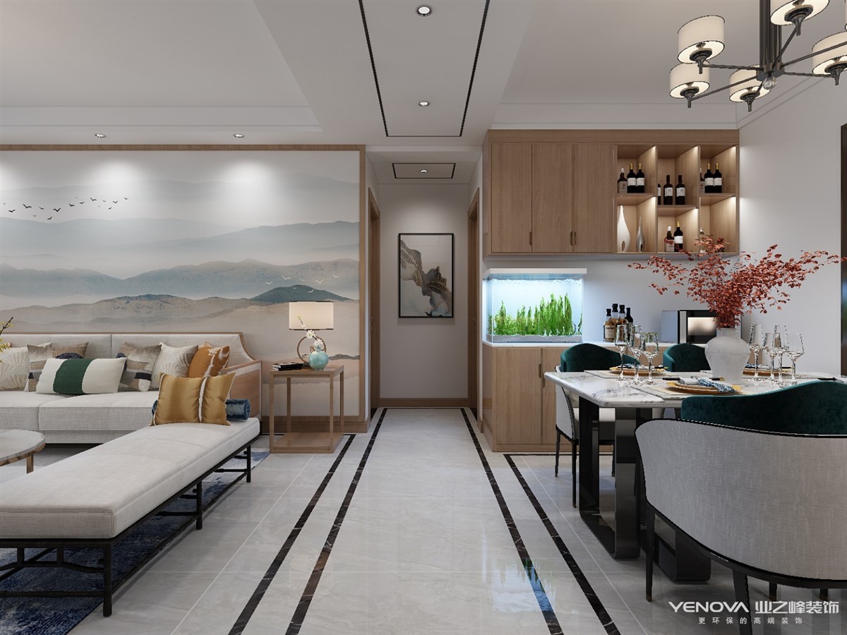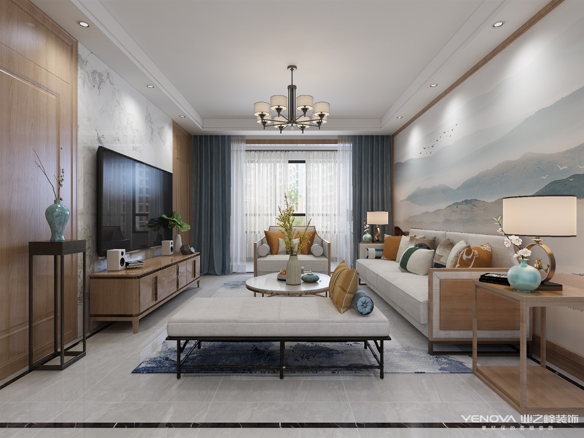 本案为一套三室两厅平层住宅,装修风格为新中式风格,客厅沙发后背景墙采用山水画装饰,充分体现其中式风格。吊顶为现代风格的直吊顶,搭配上简洁的石膏素线装饰整个顶面,整个空间以浅原木纹色为主,电视柜、茶几等家具都用了中式的原木色家具。使“”新中式“”更加实用,更富现代感。