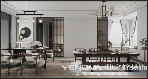 本案设计风格为现代中式,颜色以白色和绿色为主,整个空赋有古典韵味的同时,又不失简洁大方。本案客厅摒弃了传统的沙发,在客厅布置茶台,无论是会客还是自己休闲品茗,都可以满足户主需求;