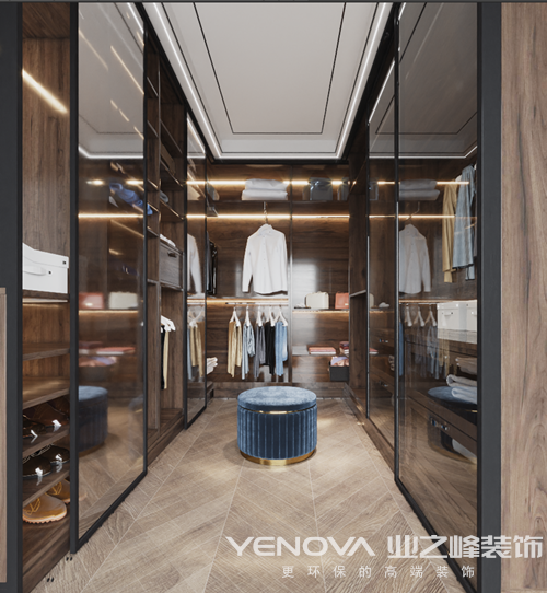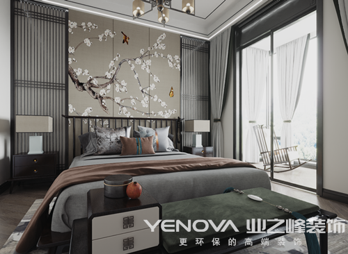 主卧设有超大衣帽间,满足户主及家人当季以及换季衣物的储存,还有精致梳妆台,满足女主人平时化妆的需要,床头背景墙运用了中式的古典元素,木栅格屏风搭配中式花鸟硬包,