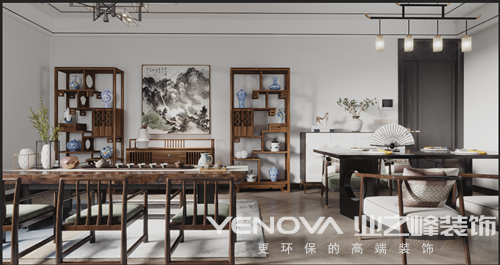 一旁设有博古架,可放置业主藏品,极富古典韵味,雅致悠然,体现户主的高雅品味。