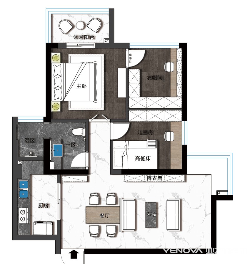 入户门尽头设有玄关柜,墙上挂有圆形挂饰,圆有团圆之意,寓意美好。儿童房设有高低床,满足两个小朋友同时使用,节省空间的同时增加了更多空间的趣味性;还配有超长书桌,
