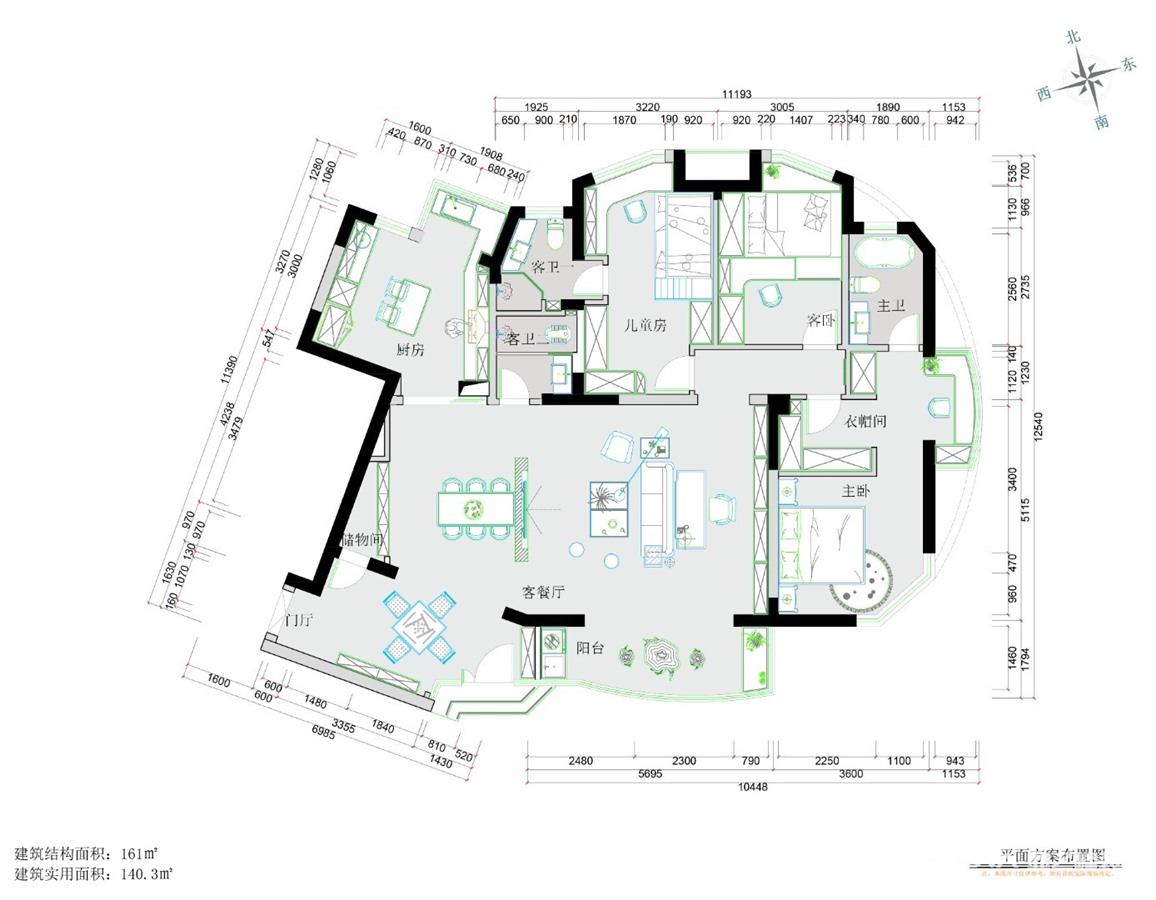 希望可以额外增加一个卫生间供儿童房使用并且主卧需要独立衣帽间。女主人希望有一个独立的衣帽梳妆间,男孩房想要地中海风格。在原结构基础上把北南阳台归为主卧所有,主卧再原有基础上面积扩大,使用起来更加的舒适。