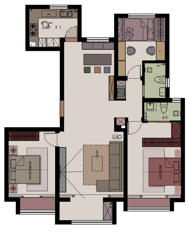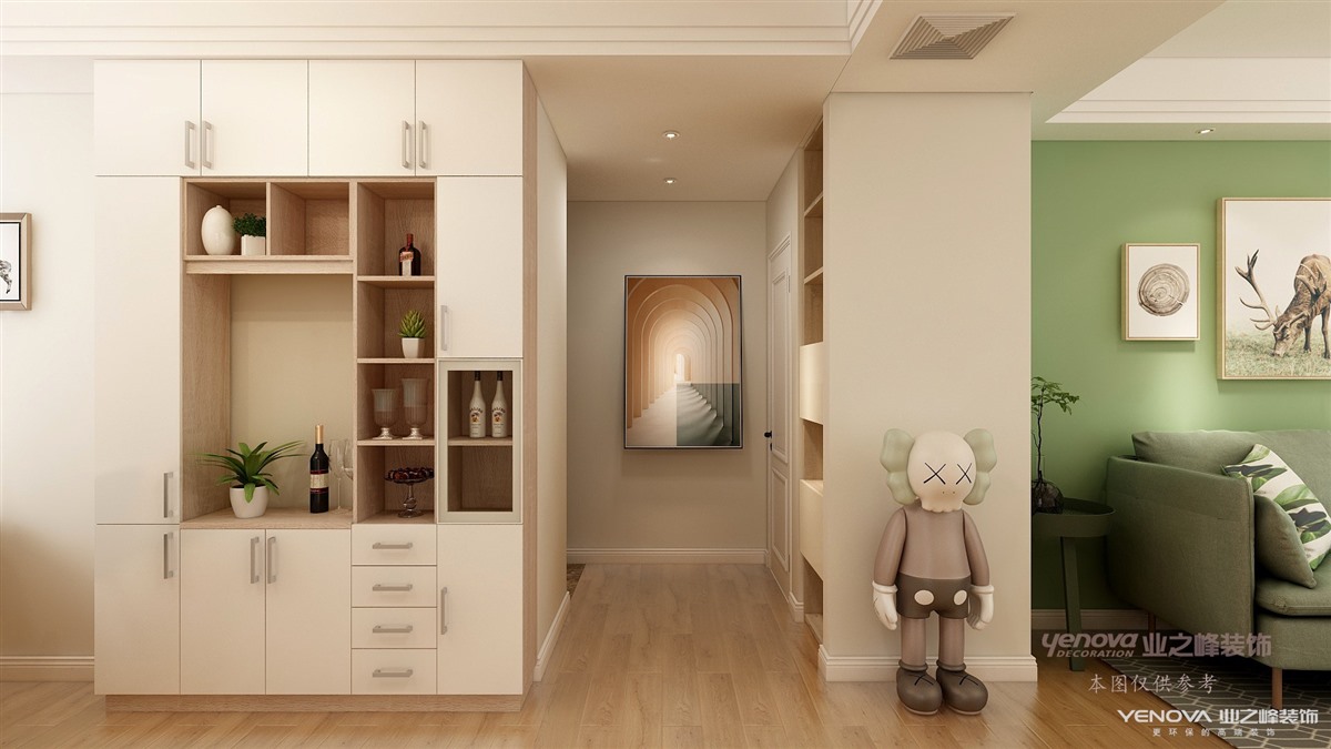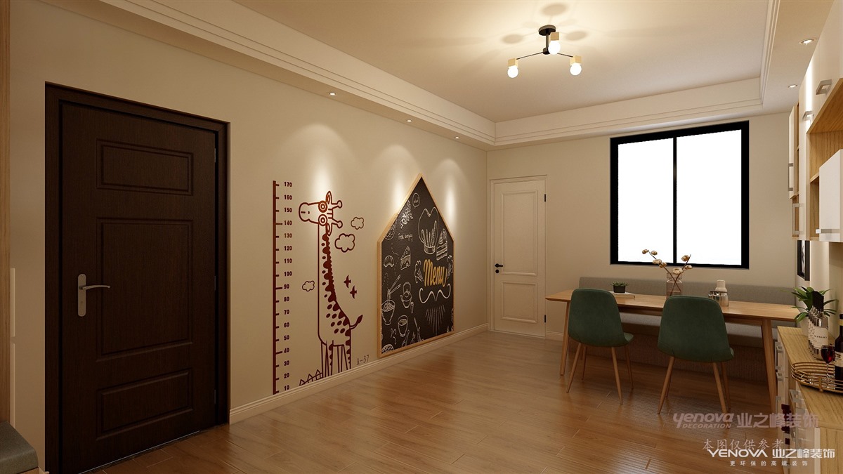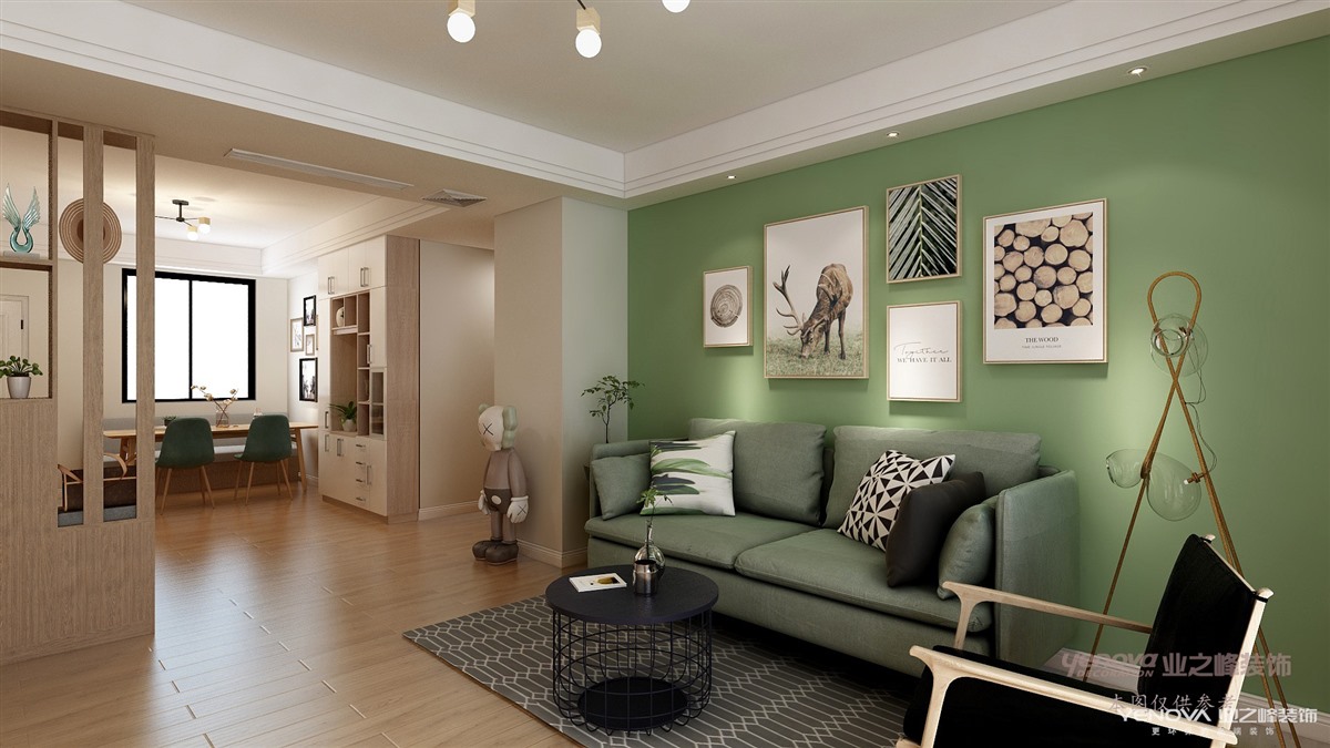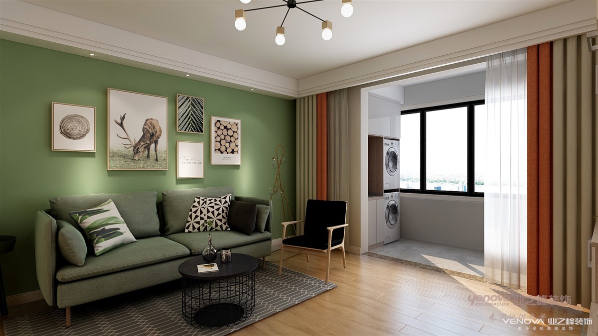 本案以功能布局为核心,采用了白、绿色、木纹、点缀色橘色调,在整个空间里呈现的是灵动跳跃的文艺氛围,绿色给人清新自然的感觉,加上原木的肌理仿佛置身于大自然中,以创造一个舒缓,放松和宁静的环境,在加上活泼的橘色,使整个空间静谧而不失灵动。