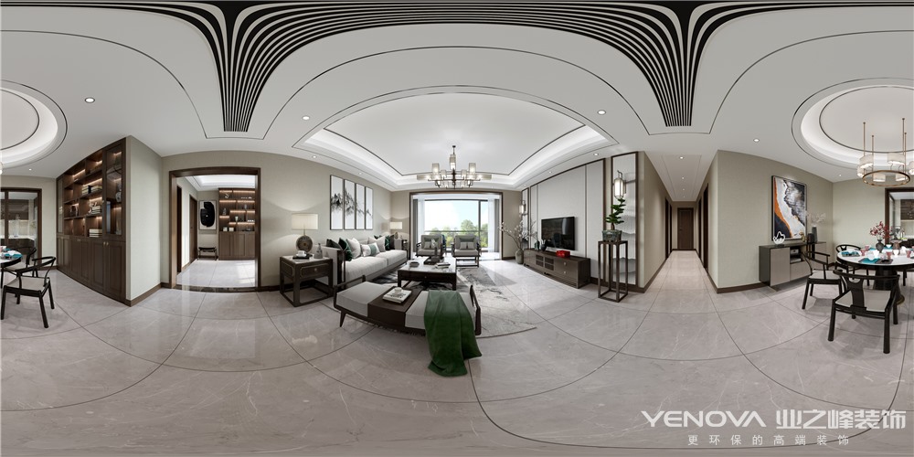 本方案风格为新中式风格,本次设计案例中采用的以简为中心,体现文化与时尚相结合的设计理念,灰色的仿石材地砖不带任何边带的修饰,简单而有细节体现,墙面以简单线条勾勒出新中式的立体感,顶面也采用现代金属装饰线条点缀,没有过多复杂造型与累赘。整个空间主要采用软装搭配来体现新中式韵味,以简洁的线条勾勒空间,令空间的框架简练、明朗。同整体空间简约优美,带出浅浅的现代硬朗的风情,却不着重笔,令线条彰显出一种流畅的动感。简洁的柱体再行略显庄重,家居的整体韵调悠然而出。