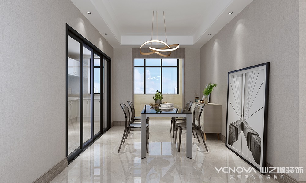 家具的颜色整体偏灰色,客户在吊顶上的处理也十分简单。设计师也在最大程度上给客户设计出了最舒适的空间。空间整体气质稳重,讲究化繁为简,不做多余的装饰,用留白的方式处理视觉比重最大的墙面、天花,减少视觉的过度负担,餐桌上绿植的点缀也给空间营造出温馨的氛围,给人一种自然的气息。