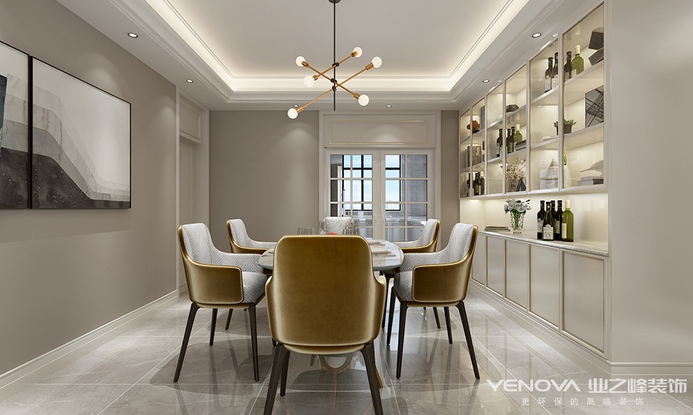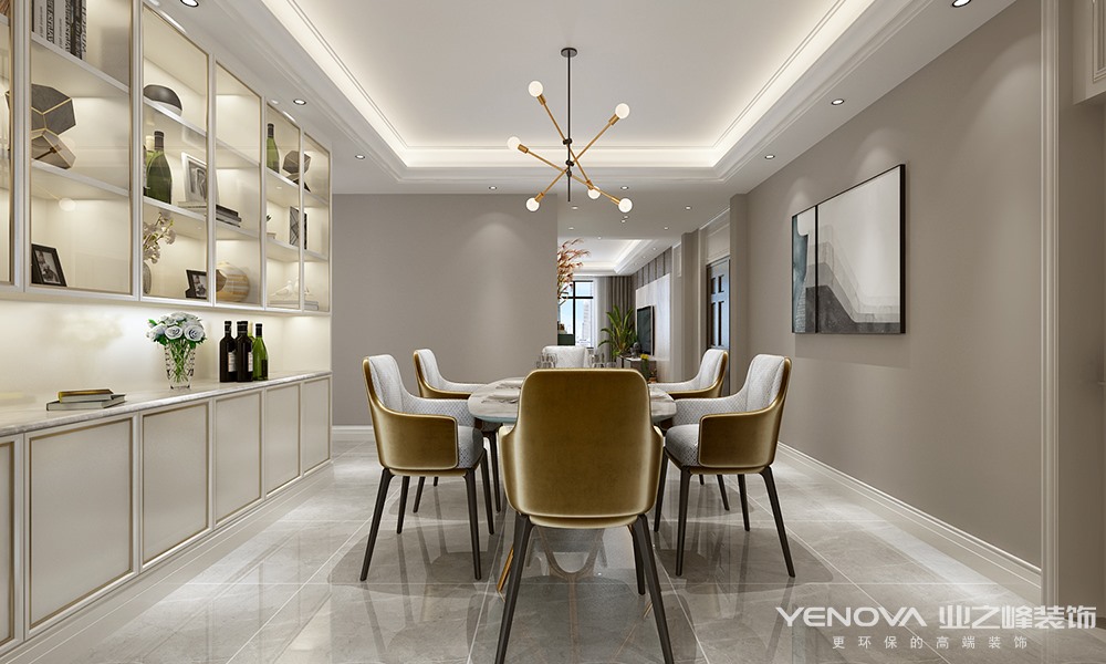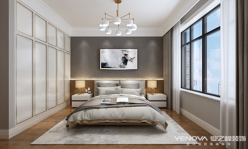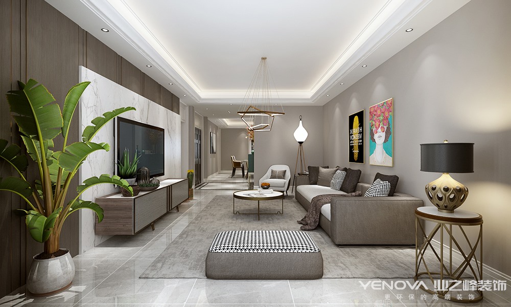 客户有孩子,有老人,所以在风格上选择了现代简约风格,家具的颜色整体偏灰色,但是要运用灯光的点缀,整体造型看起来比较大方,家具的配色上设计师也充分将老人与小孩都喜欢的颜色结合起来进行设计,使整个空间看起来都十分具有协调性。