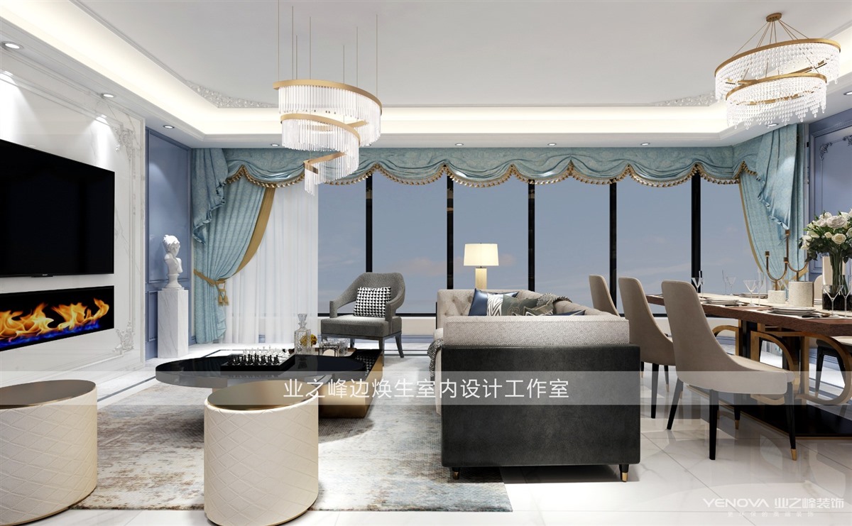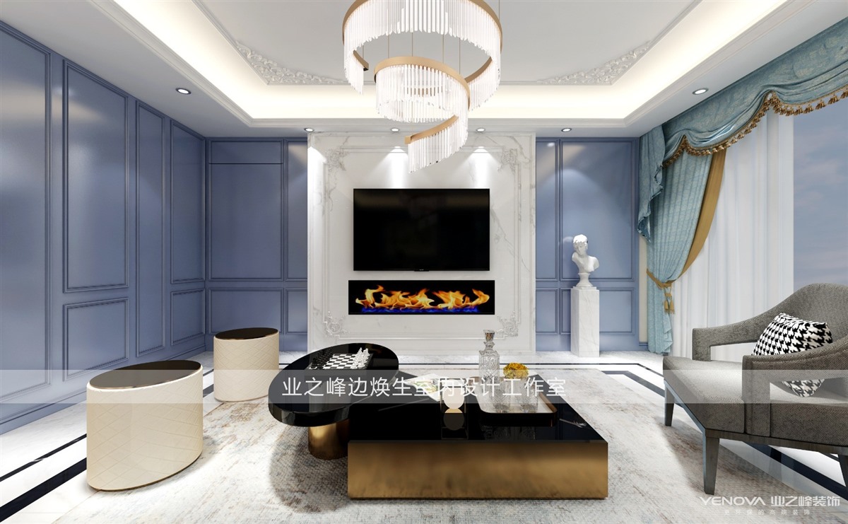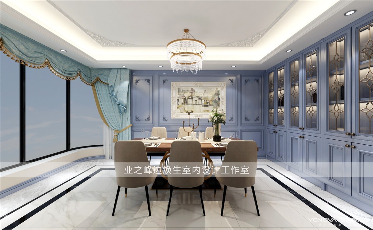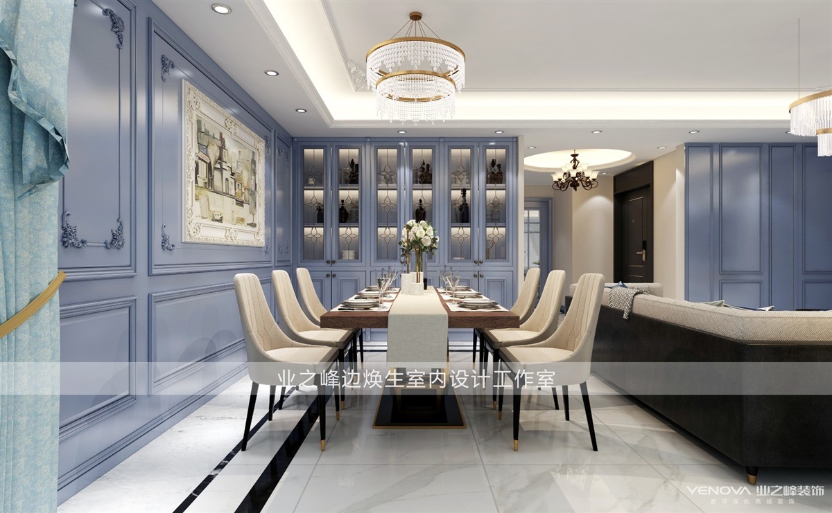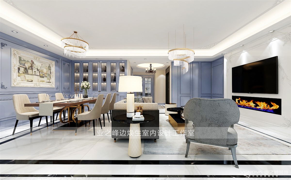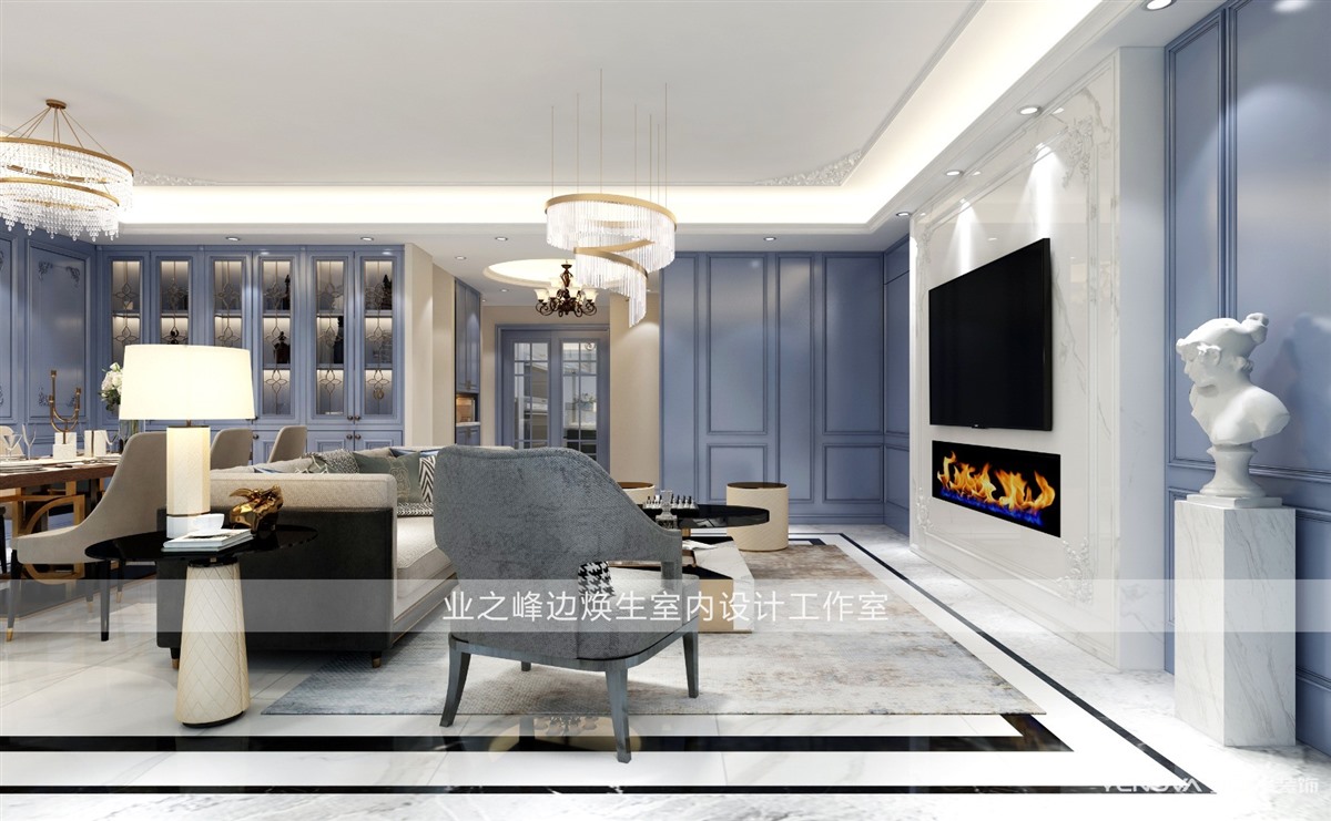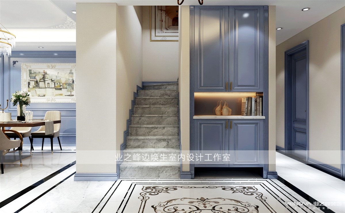 景粼原著176平方,风格美式。本案例是顶楼复式,一楼客餐厅瓷砖,卧室木地板,采用中央空调和新风系统。整体采用木质护墙板,和石材。颜色是灰蓝色。空间时尚大气。