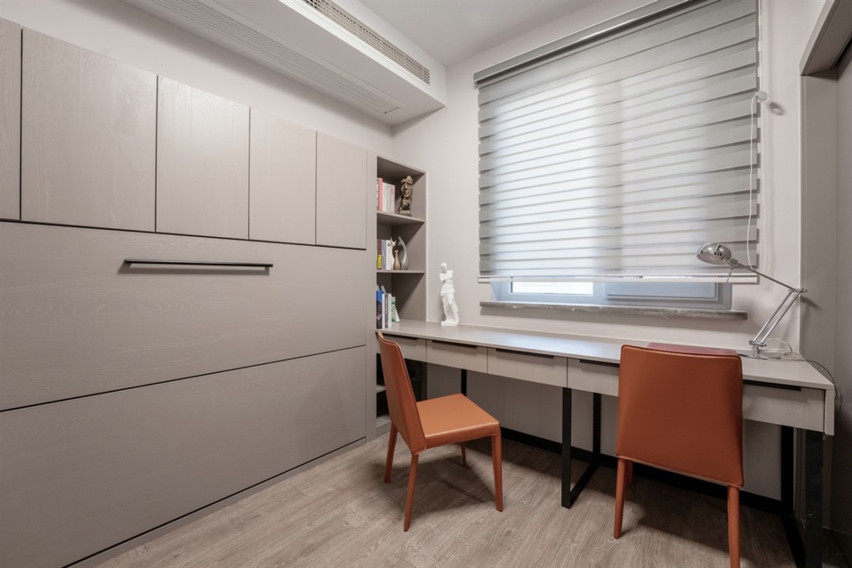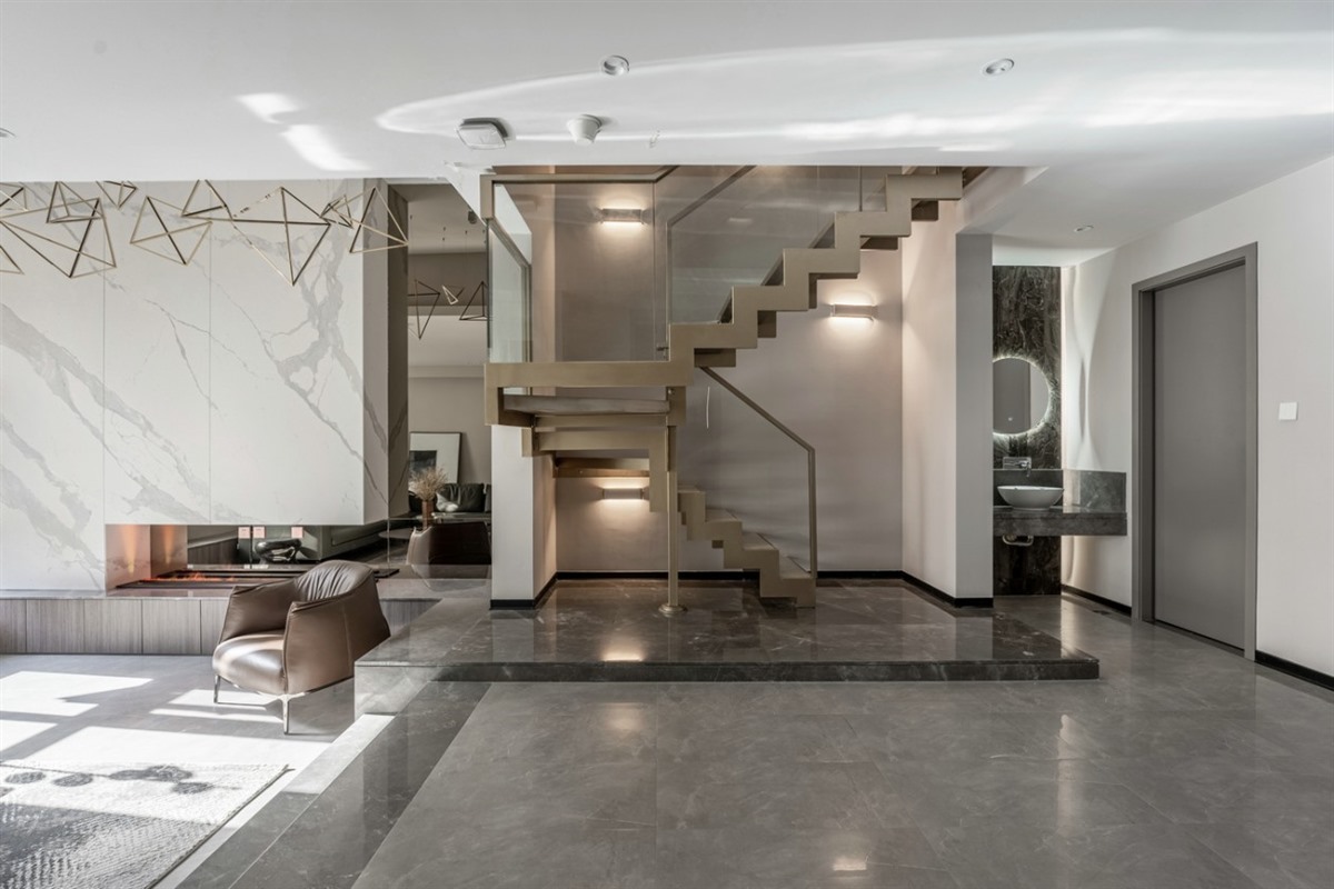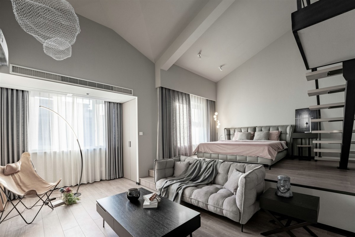 主卧室采用与儿童空间的统一色调,于极简中展现空间的极限美,静定且不动声色,无论是房间一隅的闲椅,还是弧形吊灯,迎面而来的均是放松与随性的气息。两面玻璃让阳光充分灌注进这个空间,悬空楼梯和玻璃护栏让空间得以“解放“,也让你的天性在这个卧室得以释放。