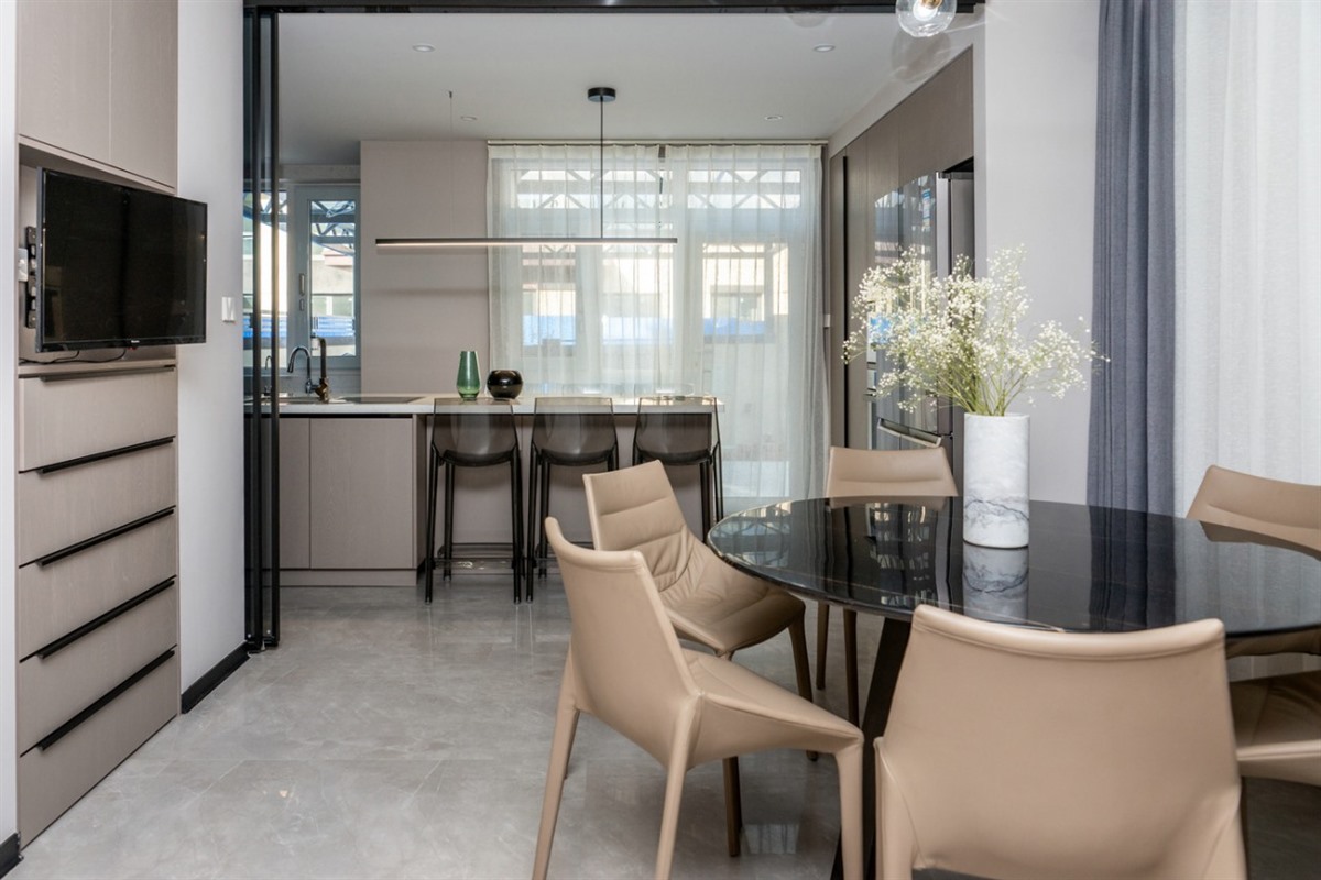 大面积的原木色温润如玉,集聚了自然的精粹的颜色,加上白墙的相映,让整个环境散发出一种舒适的气氛,为空间留住温润静谧的流年时光。圆形吊顶平衡了线条所带来的硬朗,让空间的温度集聚在此处。