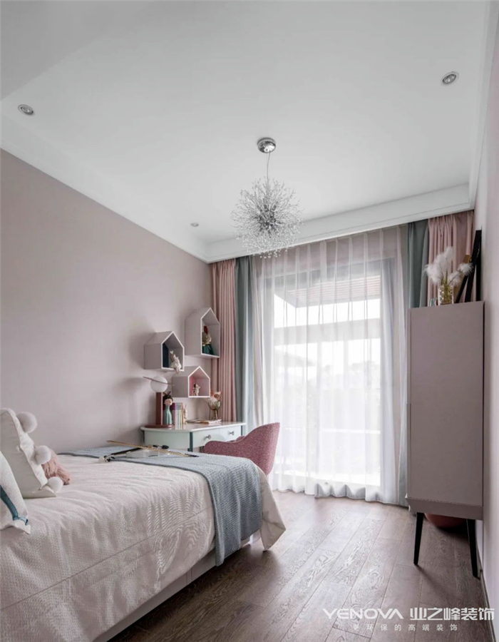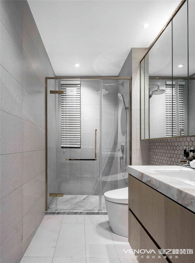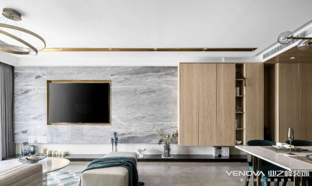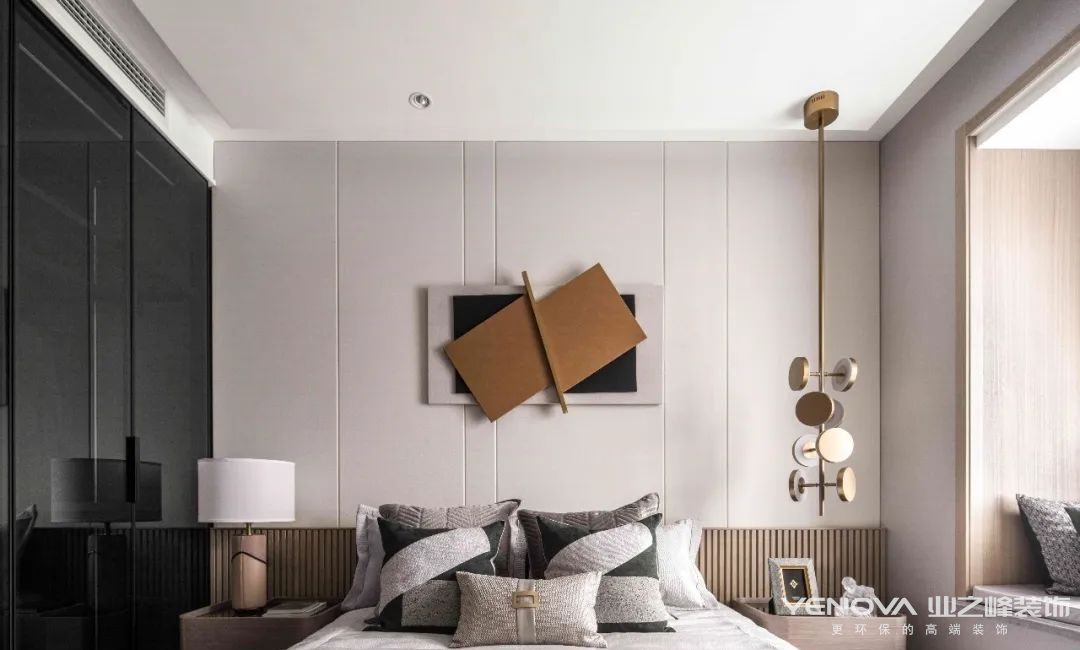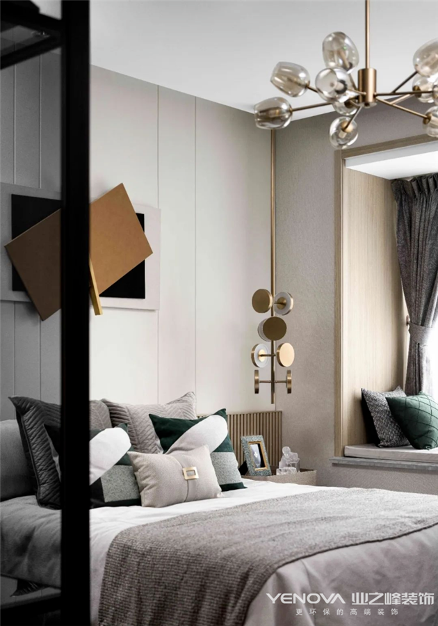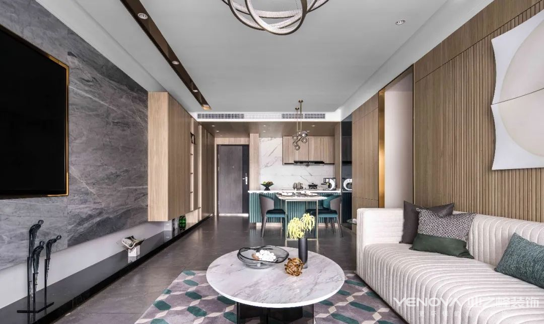 客餐厅主要以原木色为基调,宝石绿点缀空间,呈现出自然舒适的生活感。客餐厅与厨房为开放空间,赋予空间艺术、雅致而自由的生活氛围。入户设置鞋柜,沿着动线延伸引出电视背景墙。大理石、金属和木饰面的交错组合,丰富客厅的层次感。从入口到共享空间,有节奏的呈现了简单明快、合理的结构。沙发区以温柔的木色、米灰色作为主色,搭配跳跃的绿色,藉由造型和色彩的纯粹性,与线条分明的硬装相契合,线面组合达成了一种时尚与温馨的平衡。开放式厨房和餐厅设计,既相互联系,又分区明确,餐厨体验更加自由,餐椅与吧台外立面采用宝石绿与金属色搭配,优雅又不失精致,带来舒适的生活感。主卧背景使用木饰面和皮革硬包,材质与肌理的协调关系柔和了整个空间,金属色平衡整个调性,塑造温馨舒适的休憩空间。卫生间以灰色砖为主基调,简约的设计保持整洁感和舒适性。