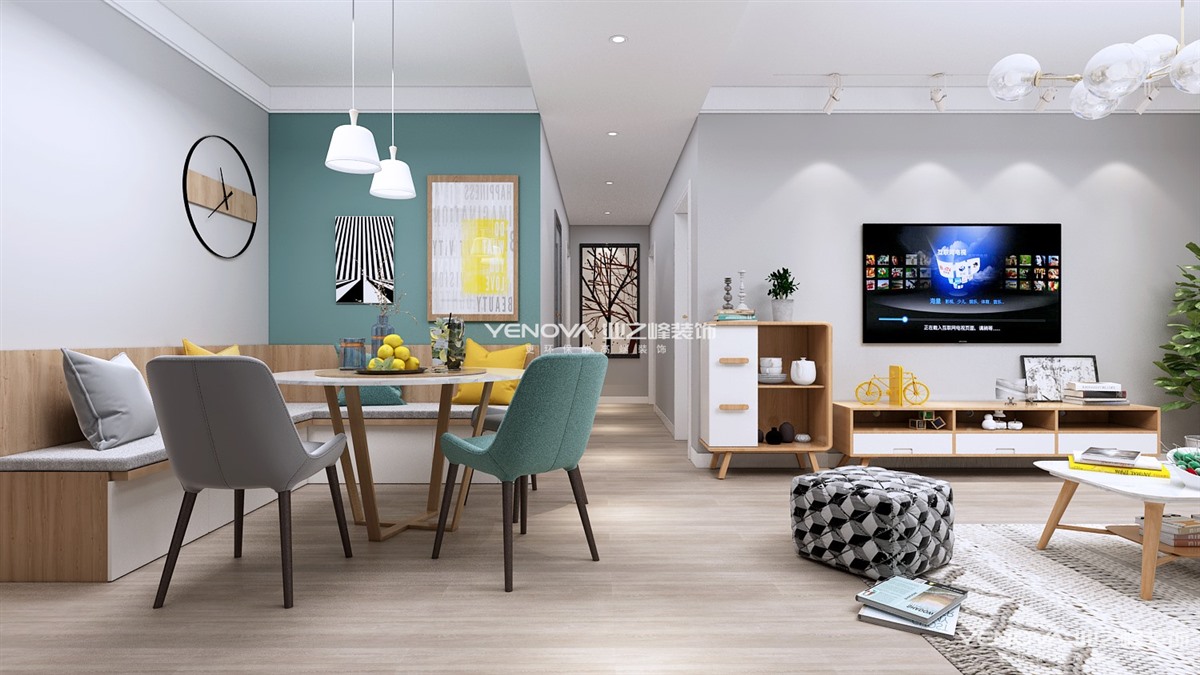本案是现代北欧风格,根据家庭成员的生活习惯,在家居设计上,简洁、干练,让家中呈现一种自然的舒适、干净之美。木质地板,拼色的乳胶漆墙面,现代与自然元素想结合,温暖的色调一致搭配。让整个餐厅温暖起来。再加上卡座的设计,让家居生活更轻松随性。 多种暖色调的融合,让餐厅氛围立刻活跃起来,白色的圆形餐桌,优美的线条加上精细的雕刻散发出它高雅的气质,也与孔雀蓝色餐椅搭配。
