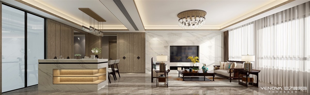 本案的设计难点在于电梯安装位置的确定,以及客户主要生活空间的合理规划。设计的本心是源于生活,对于本案而言,过于奢华的设计会呈现极佳的效果,但是否适用于每一个客户是值得深思的问题。阳光透过纱窗,从窗外洒满整个客厅,质感细腻的大白花大理石将山色湖光的灵动掷于墙上,搭配哑光质感的银檀木,在空间内渲染而开。