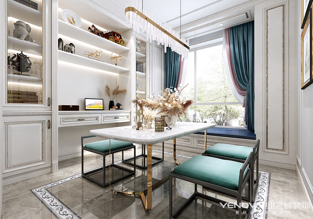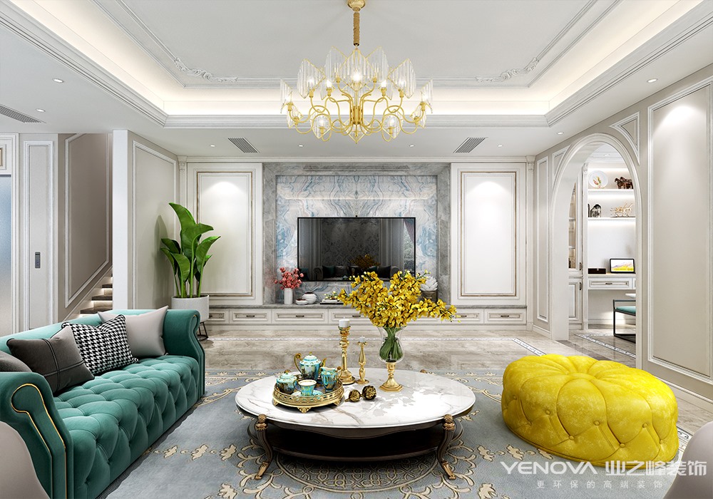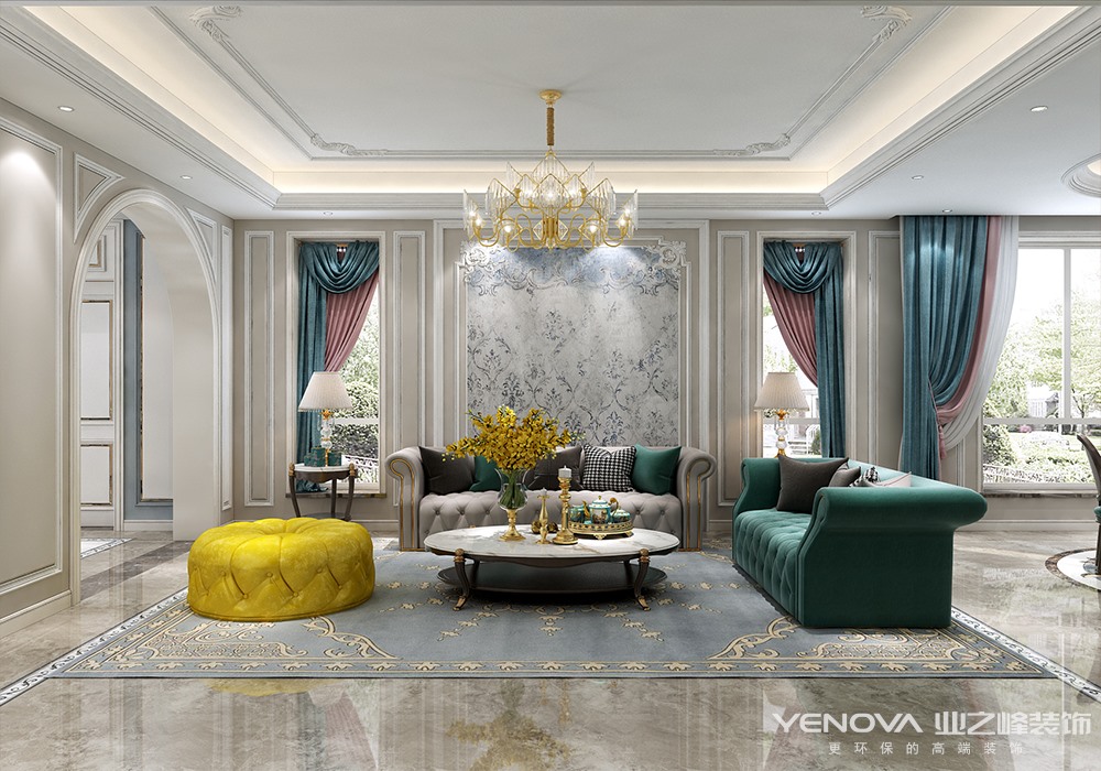 本案的设计风格为轻奢法式,营造典雅、舒适、高贵的气质,浪漫的情调是本案的主题。设计手法上从整体到局部、从空间到室内陈列塑造,都给人一种精美印象。不同质感的表现、斑斓色彩的碰撞,真皮和金属结合的家具有助于凸起品质和高雅,壁纸、地毯、家具、外罩等装饰织物安置的家居,蕴涵着传统的历史陈迹与深厚的文化底蕴,同时又摒弃了传统法式风格过于复杂的肌理和装饰,接收现代风格的长处,简化了线条,凸显简练美,塑造尊贵高雅的居家氛围。