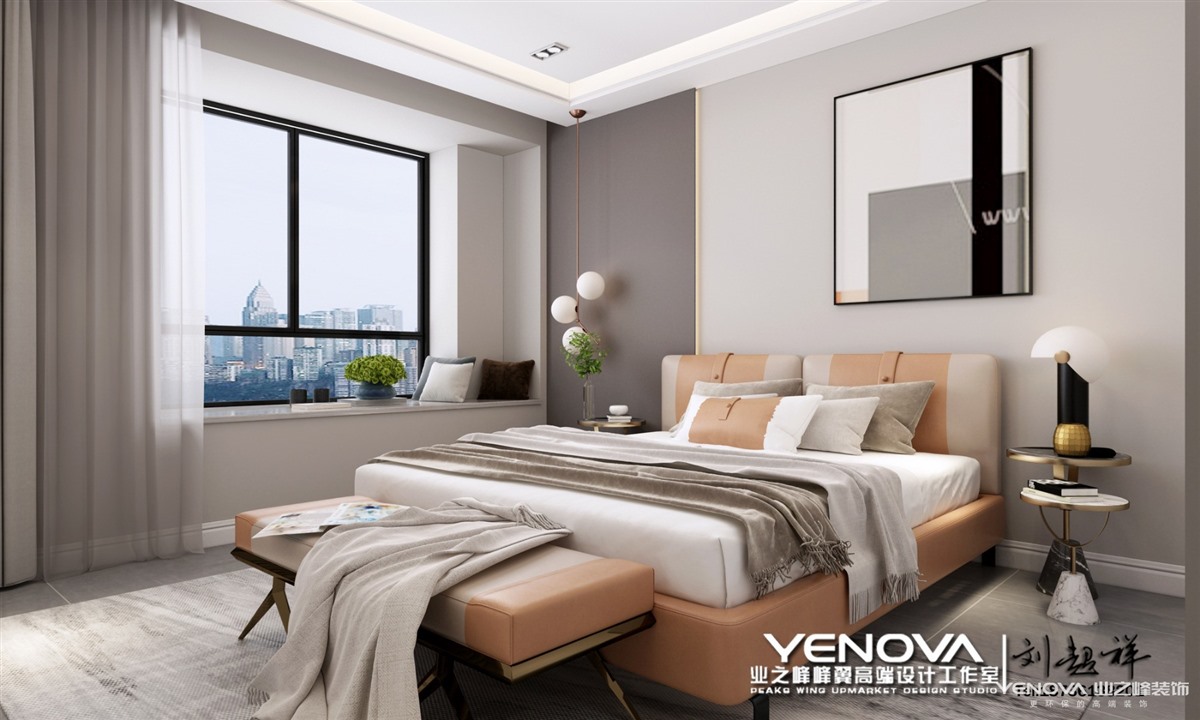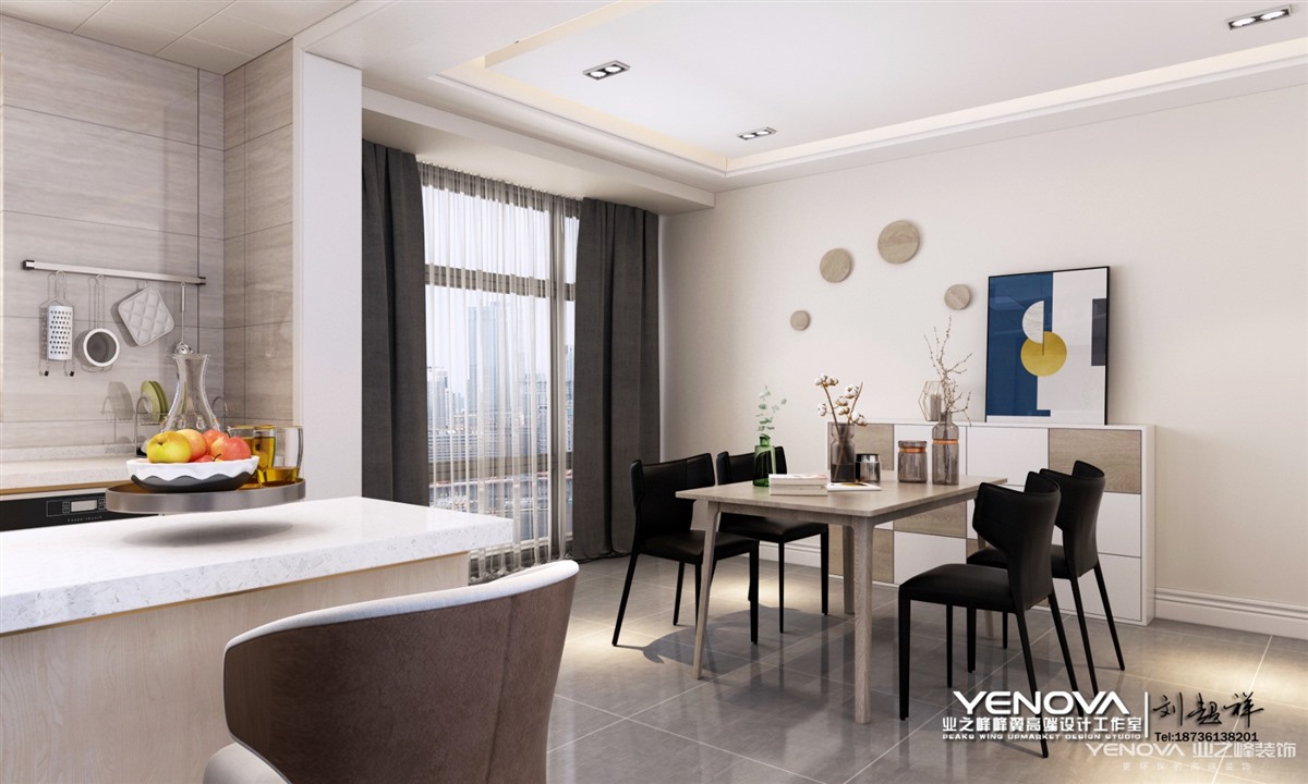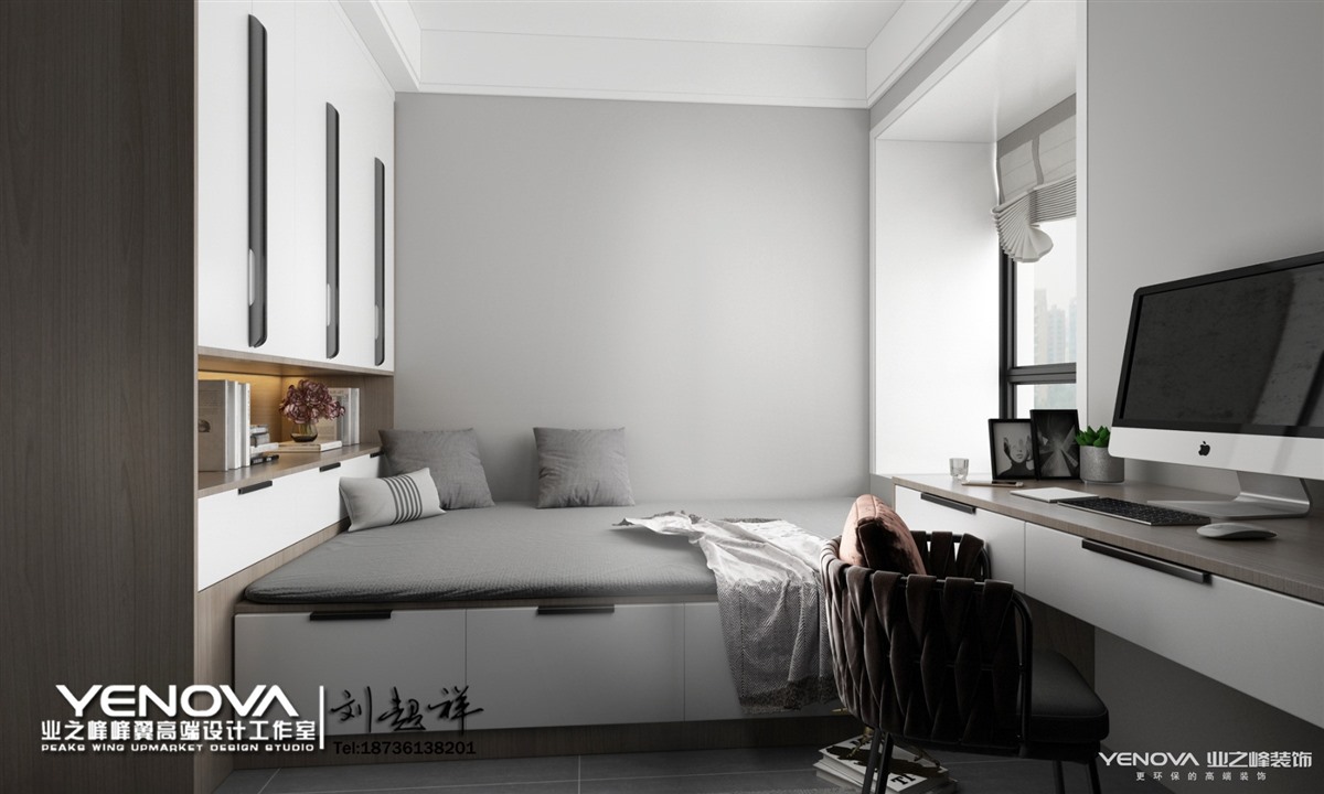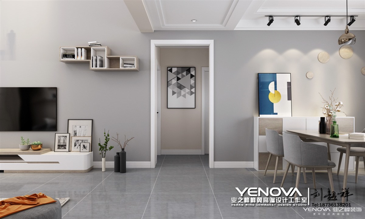 关于色调,业主希望最终效果是可以让空间显得开阔明亮不局促,但是也不能太冰冷,需要有家的温馨感。所以选用暖白调为背景色,灰色调做主色,白色块面柔化暖色的燥热和灰色的冰冷。在电视背景的设计上摒弃虚华与厚重的材质,用简单的文化石膏砖刷白代替传统的白色墙板,以灰色为背景墙基色,同时