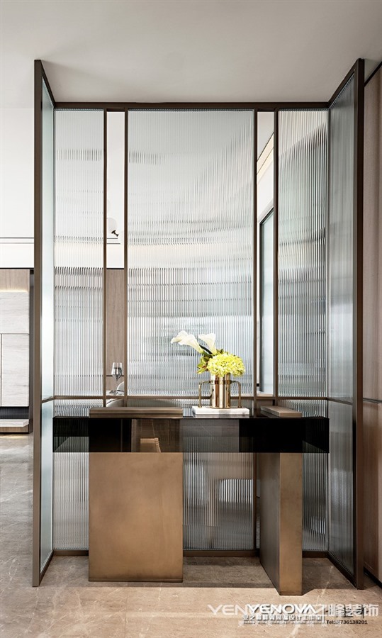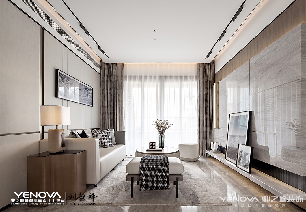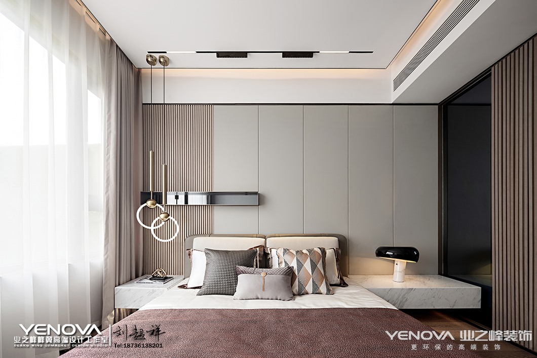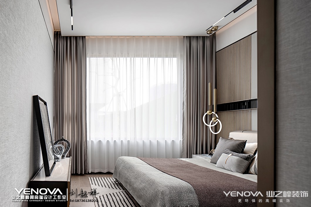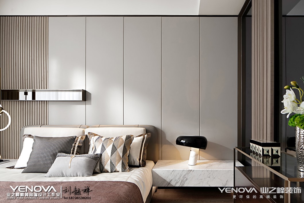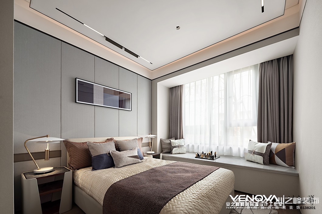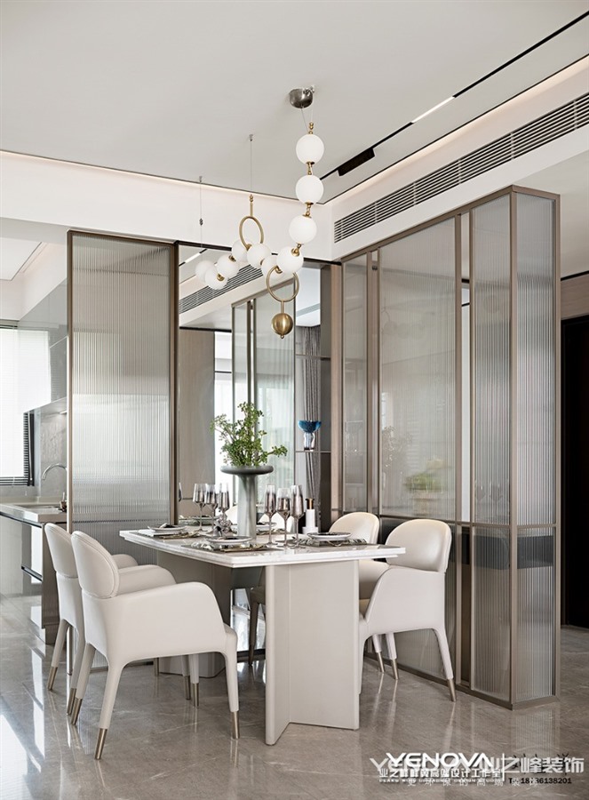 家,是情感与爱交融的场所,它并不需要金碧辉煌,亦不需要气势恢宏,它需要的是温暖和谐的生活意境以及符合居住者气质的生活方式。本案设计从情感出发,结合自然反璞色系的运用,营造了一个宁静质朴的家。空间是由物体组成和创造的,在此基础上完成了本案95㎡空间功能及层次的建造。场域布局依据行动路线与逻辑原则划分,客餐厅与厨房连成一线,借助客厅玻璃拉门,让光线注入室内,使得整个空间通透而明亮。同时以灰白的自然反璞色系作为空间的主色调,同时将一丝日式侘寂美学融入其中,注重情感与氛围的渲染,营造出简朴素美的舒适感。大理石背景墙的天然肌理与以自然纹理为主题的墙面挂画,二者方位对立却相互呼应,营造空间的默契,使得整体空间和谐而不具有割裂感。为打造一个简约轻盈的用餐空间,营造轻松但不失品质的就餐氛围。干净的灰白色皮质座椅与两侧半透明玻璃搭配,少许银色与玫瑰金坠入其中,来自厨房与客厅的光线同时倾入,空间氛围轻松明快。餐厅一侧以半透明玻璃遮挡隔断,玻璃与玻璃之间特地留有一定间隙,使得空间隔而不断并构建出“框景”,玻璃隔断在另一侧则以半围合的方式呈现,重新构筑成一个独立的小空间,并在此设立桌面并放置装饰品,一处端景由此构建。主卧,以简洁工整的大理石桌台代替样式各异的床头边桌,赋予空间更宽敞的置物平台,再搭配同色系低亮度的软装饰物,空间沉静而美好。一幅以线条交织形成像素点并以色块拼接方式呈现的艺术挂画,蕴藏着有序、律动以及碰撞美学,以此幅艺术挂画作为空间设计的“源点”,再扩散至线、面,直至整个空间。空间里最终呈现的所有颜色皆在挂画中出现,抱枕中出现的格子元素是对挂画的呼应,左右两侧一模一样的两个边桌以及台灯所呈现出的对称美在挂画中亦可窥见。