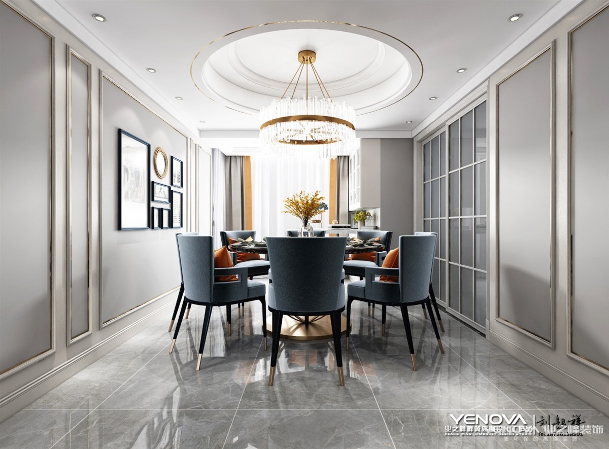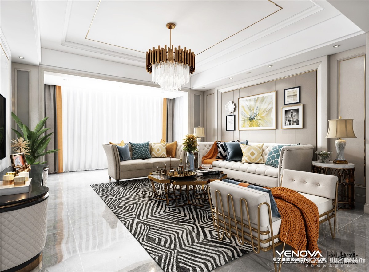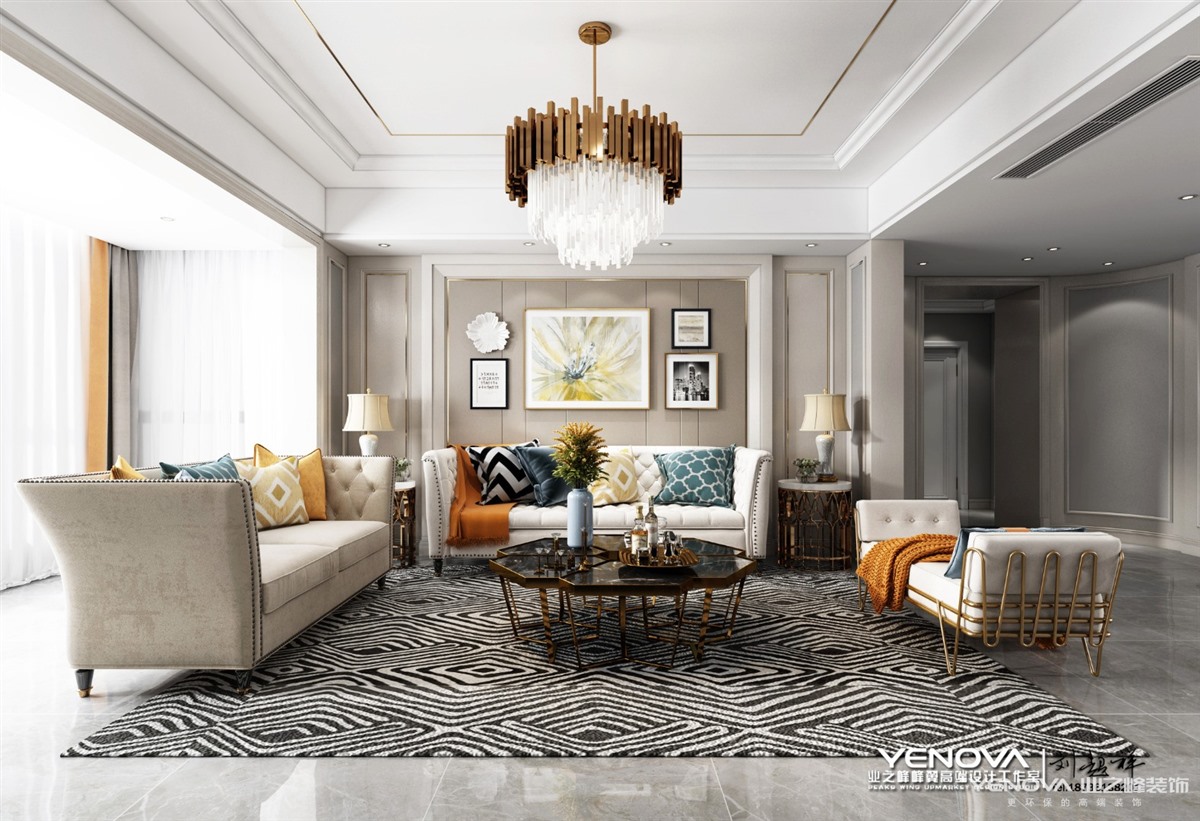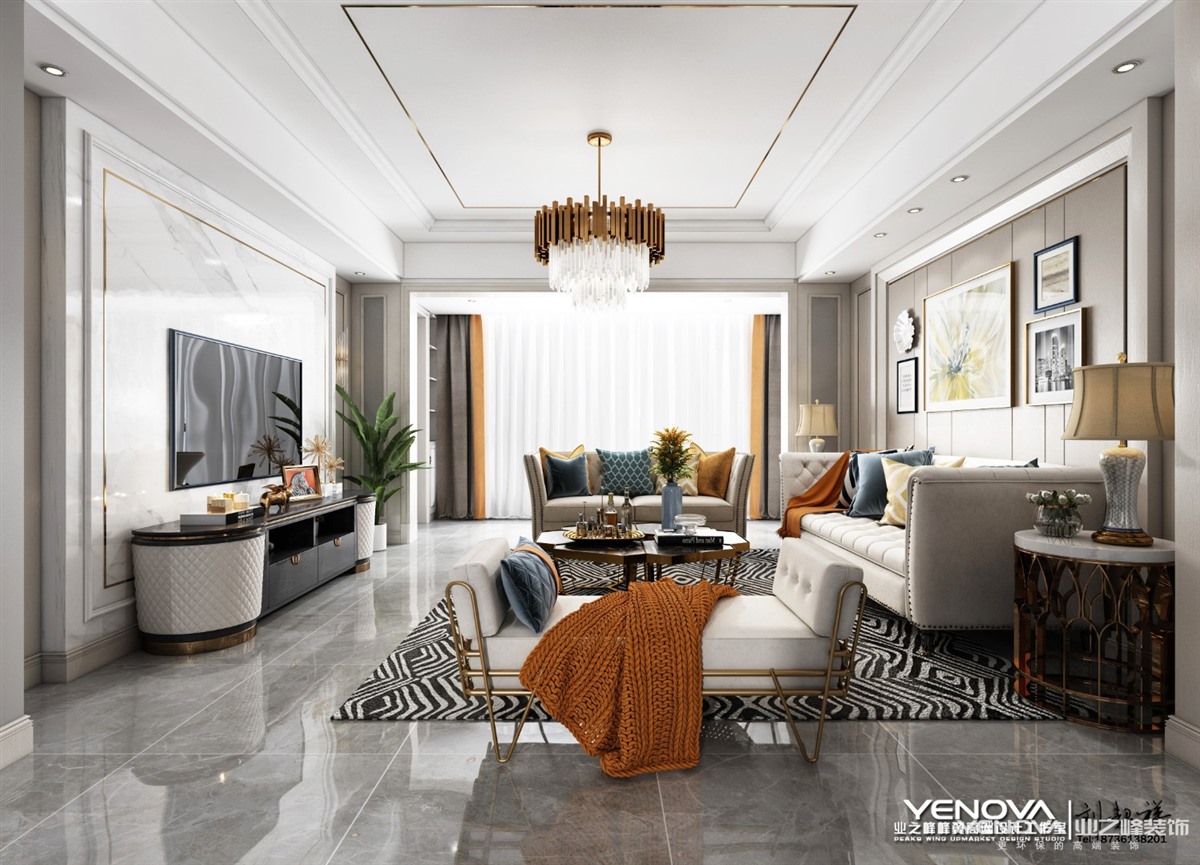 美,是给人们带来愉悦感受的源头。本案以居者对幸福的憧憬和美好想象为设计之源,用设计语汇创造充满仪式感的生活形态,去唤醒居者发掘日常美好的好奇心,让他们享受每一个当下。在客厅,设计融合了对美式与轻奢的梳理与吸纳。简化的吊顶样式,素款石膏线条,整块天然石材,3+2+1造型沙发带来经典的美式风味,而同时顶面、墙面,以及家具配饰上的金属点缀则让空间自然而然地生发出了轻奢的质感。用色上,高雅的灰与稳重的咖色,为空间带来了没有距离感的生趣与丰富。在这里,生活明朗,万物可爱。主卧,延续公共区域的基调,增加轻奢,减淡美式味道,并浓缩两种风格其中,以暖黄为主色调,营造轻松与愉悦的空间氛围。落地窗前,居者可以享受阳光浴、放空大脑,闲适自由,好不惬意。次卧,浅咖客厅