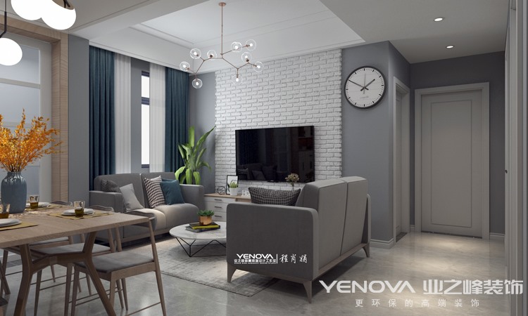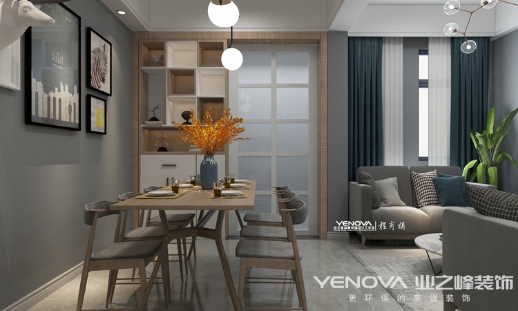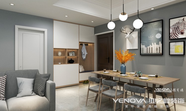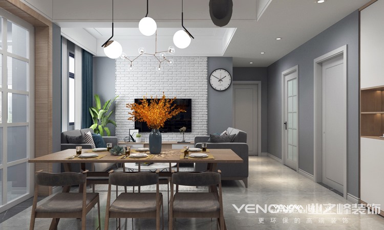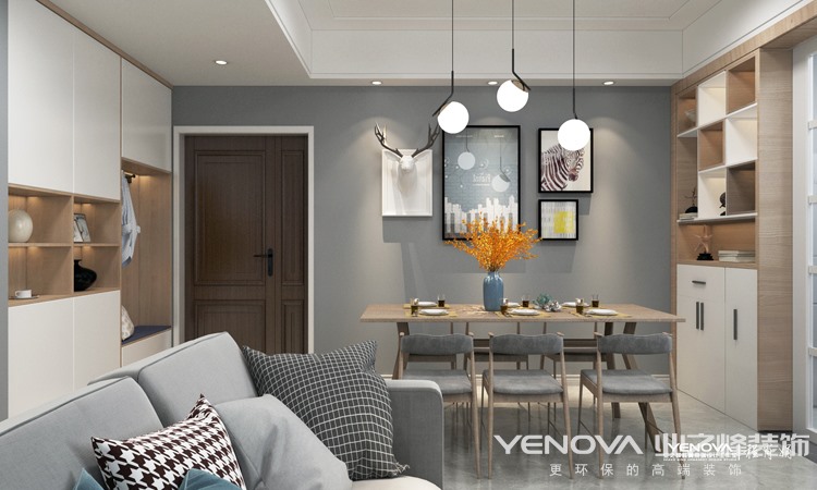 本案设计北欧风格家居设计,简洁、干练,让家中呈现一种自然的舒适、干净之美。木质柜子,灰色的墙面,餐桌椅就像那故意做旧处理的木质长桌,一股浓浓的北欧范,陪着黄色的花,更显明朗与温馨。