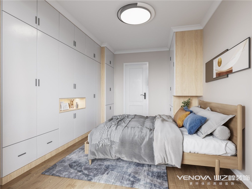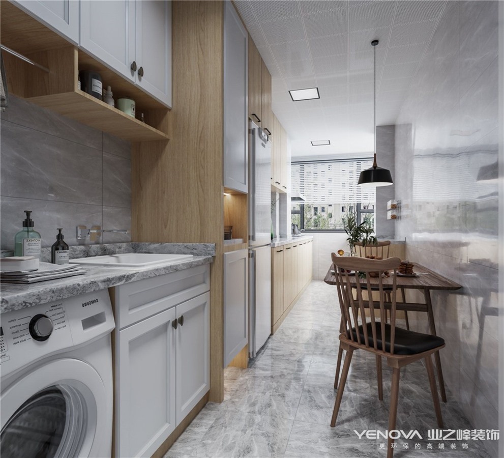 客户家衣柜储物较少,做了满排衣柜,床头一侧做了一排衣柜。床选用原木色与家里整体风格相搭配。厨房做得开放式厨房,因为格局有限,做了洗衣机柜台盆柜一体定制,做原木色橱柜,顶面做集成吊顶。厨房墙砖地砖以灰色砖为主。整个空间色调统一。简单大气。