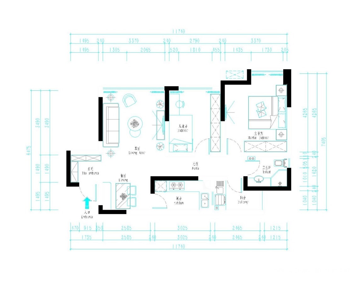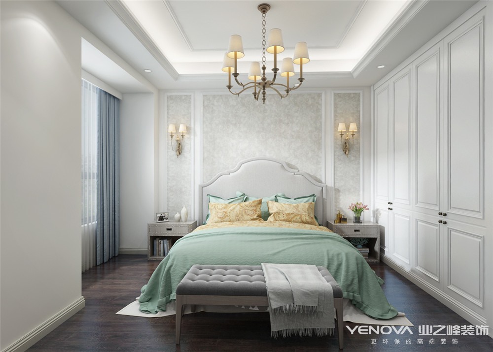 本案例摒弃了繁华的装饰,整体采用明快的色调设计,风格上结合新美式家具配合美式文化元素,从复杂到简单,从整体到局部,每个地方都显得干净利落,打造个性品味的生活态度。整体设计上给人带来清爽明快之感,宽敞的空间布局让人更加舒畅,单一的色调让人就看不腻。空间布局、色彩用用、材质的选择,都突出了简约又大气的风格。以宁静的淡蓝色为空间主色调,辅以深蓝色的床靠背软包,家居的卧室布置较为温馨,作为主人的私密空间,主要以功能性以及实用舒适为斟酌的重点,整体空间给人感觉明亮而恬静,搭配温和的木地板,舒适感倍增。