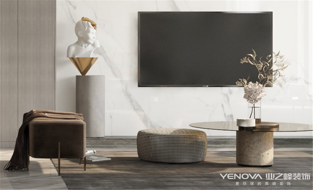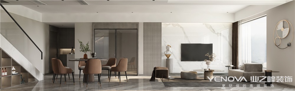 本案例是现代风格 从简到繁,再从繁到简是一个循环往复的过程,设计师将现代风格展现的淋漓尽致,大理石地板与灰白色墙面,简单纯色的布艺沙发简约又充满温度,简单用褐色布艺材料作为点缀,丰富了场景的整体效果,一些黑色线条压低场景的亮度,使得空间更具温馨感,同时呈现出一种柔和、放松、恬静的氛围,诉说不一样的居家体验。