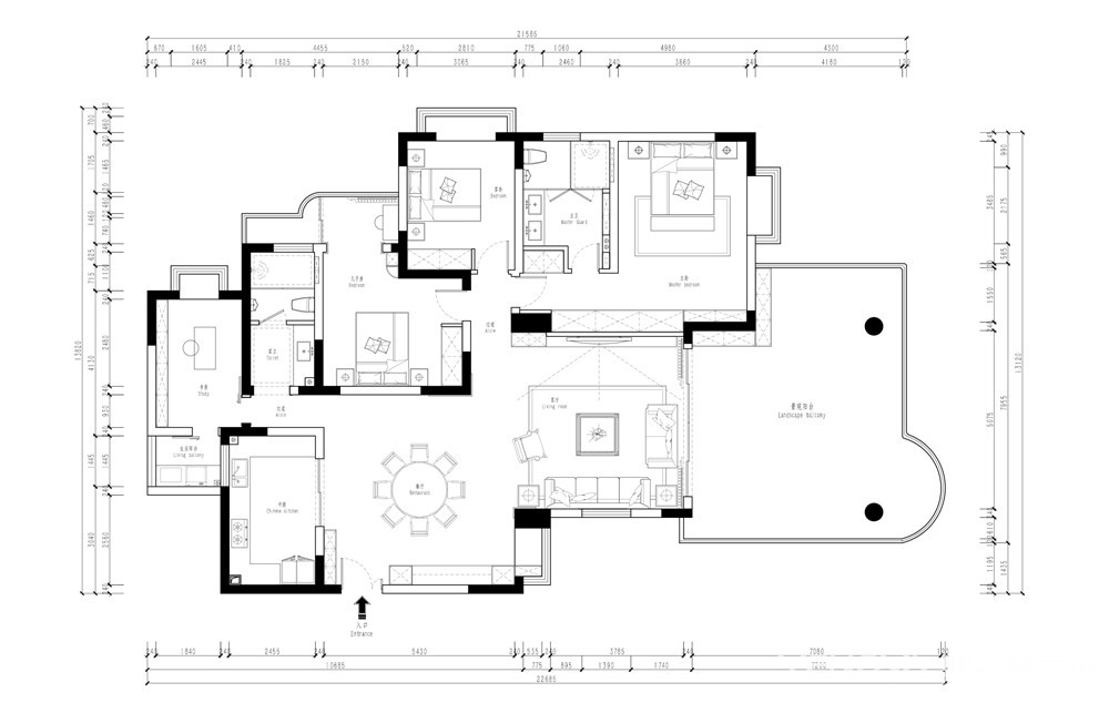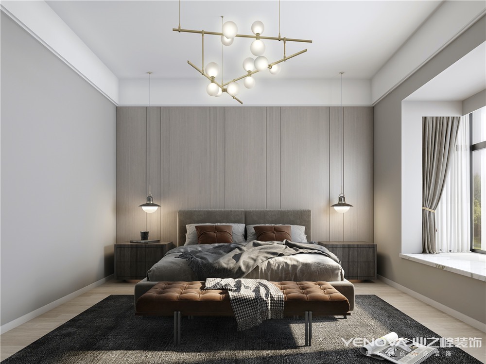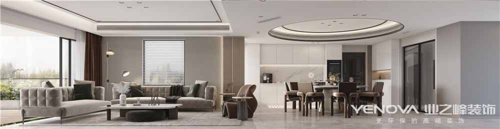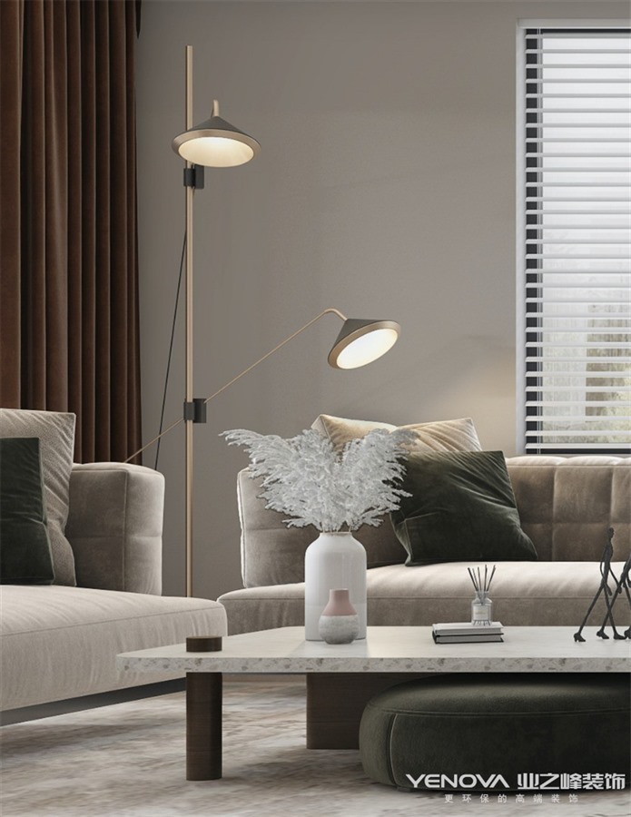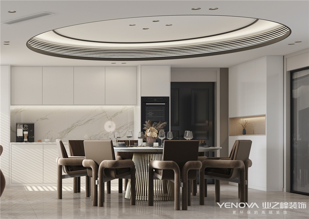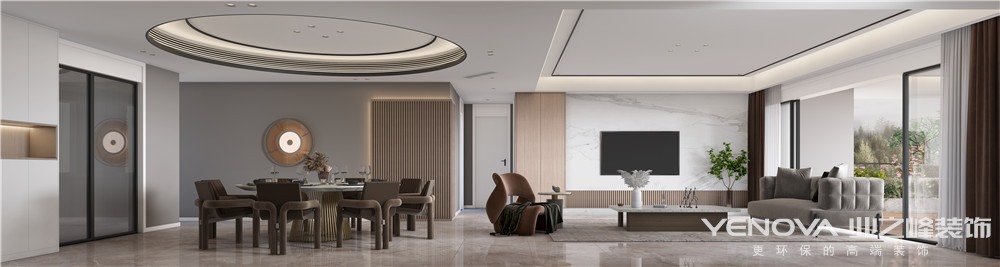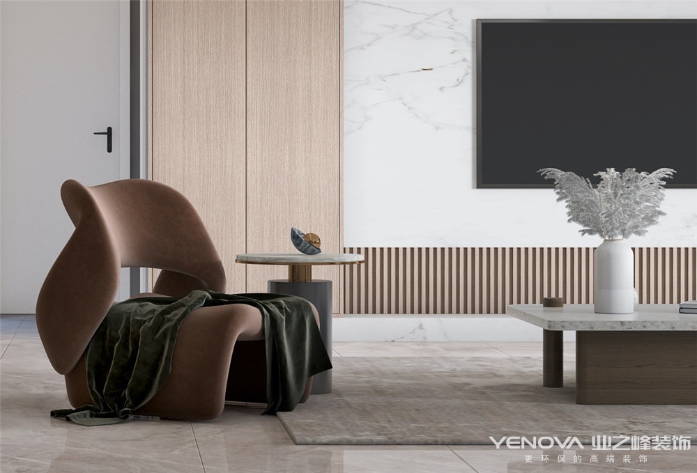 本案例是现代风格 设计师在配色及材质上做了些许调整运用简约的设计手法获得了大气的质感。会客空间自带大面的落地窗采光条件得天独厚与浅色大理石相辅相成强化通透性即便加入深色调也不会显得厚重反而可以丰富空间层次,另一面电视背景墙则选择了爵士白大理石做背景,呈现空间现代感,暖色调用于布艺沙发和窗帘也为空间增加了不少柔和韵味,单人沙发与餐椅选择褐色,深色的运用也凸显出空间的韵味,客餐厅方圆吊顶形成对比,更体现空间的层次感。木质隔断在配色上选择了优雅低调的浅木色调背景墙几笔线条也瞬间融化单调整体简约不失质感。