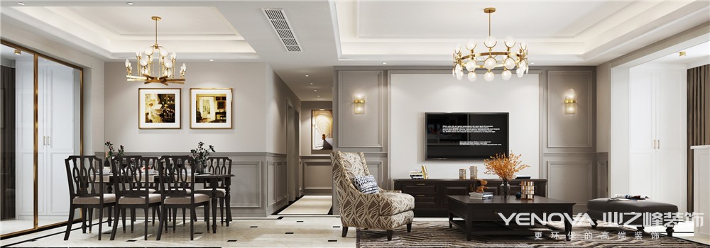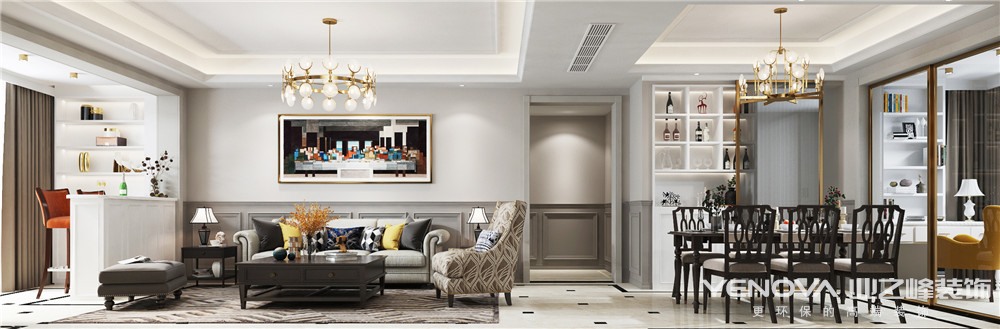本案例是轻奢美式 本案例在色调上选用了灰色和咖色,部分家具则选用了比较稳重的深木色。沙发背景用欧洲著名古典挂画做为装饰时尚,又可以增加室内的空间感,同时拓宽视野也是整个客厅空间的点睛之笔。客厅区域地面铺了地毯沙发茶几都可以落于地毯之上,增添温馨舒适的体验除了沙发凳子其它家具都是高脚的方便扫地地器人工作。金色的吊灯与筒灯的色调相呼应轻奢感屋主的品位便由这些细节之中得以体现。独特的吧台设计,不仅节省空间而且美观大气,吧台凳子采用暖色也为整个冷色空间添加活跃时尚色彩。