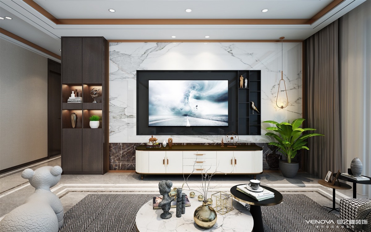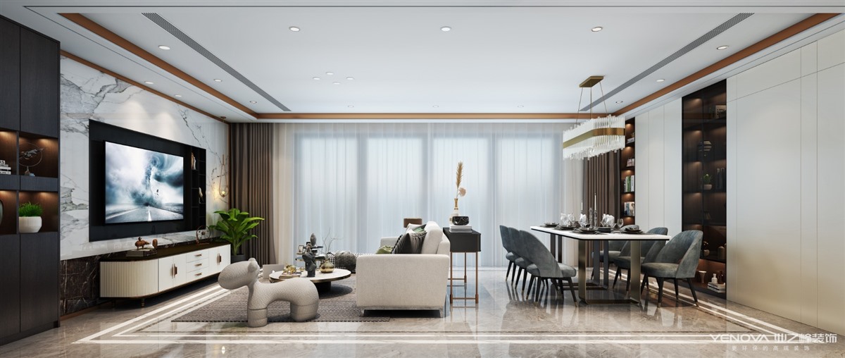 本案例轻奢风格的空间以金属、皮革的中性色调为主,用色彩的纯度传递细腻的质感。造型简洁,线条流畅的家具组合搭配,营造出稳定、协调、温馨的空间感受,满足现代年轻家庭的轻奢需求。